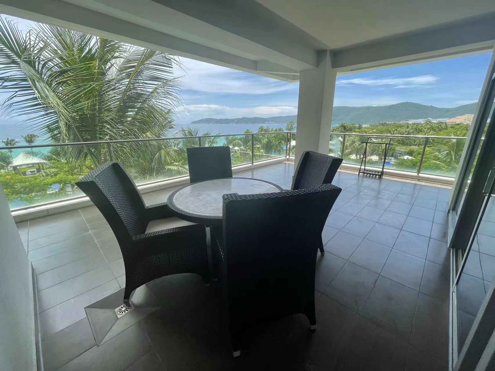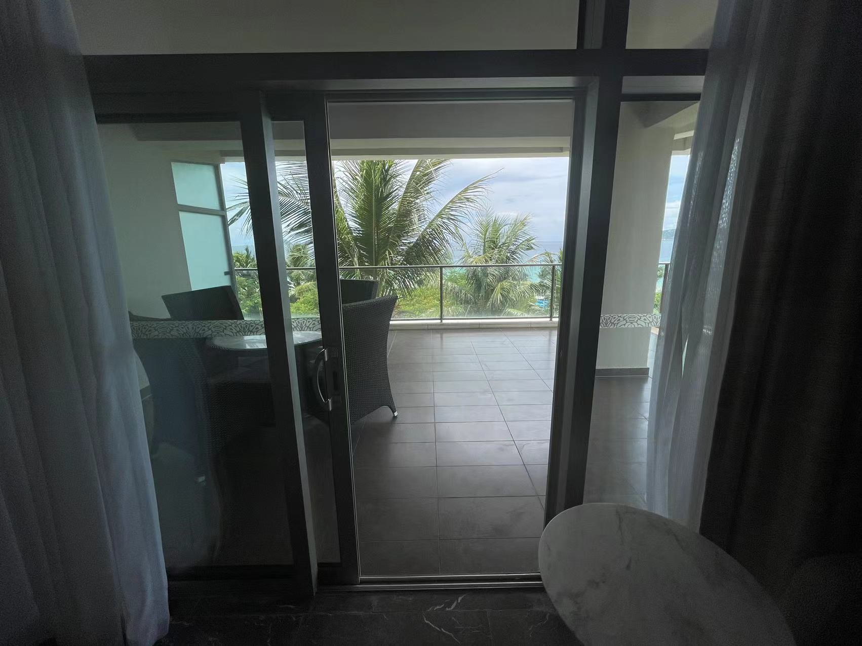 你看,推开房间的玻璃门,宽阔的阳台落落大方地呈现在我们眼前,靠左摆放着可供一家人吃饭的大圆桌,正前方是一大片海域,靠右往下看,则是一大片盎然绿意、一条条从酒店大堂直通海域的马路,这就算是酒店的中轴线了。