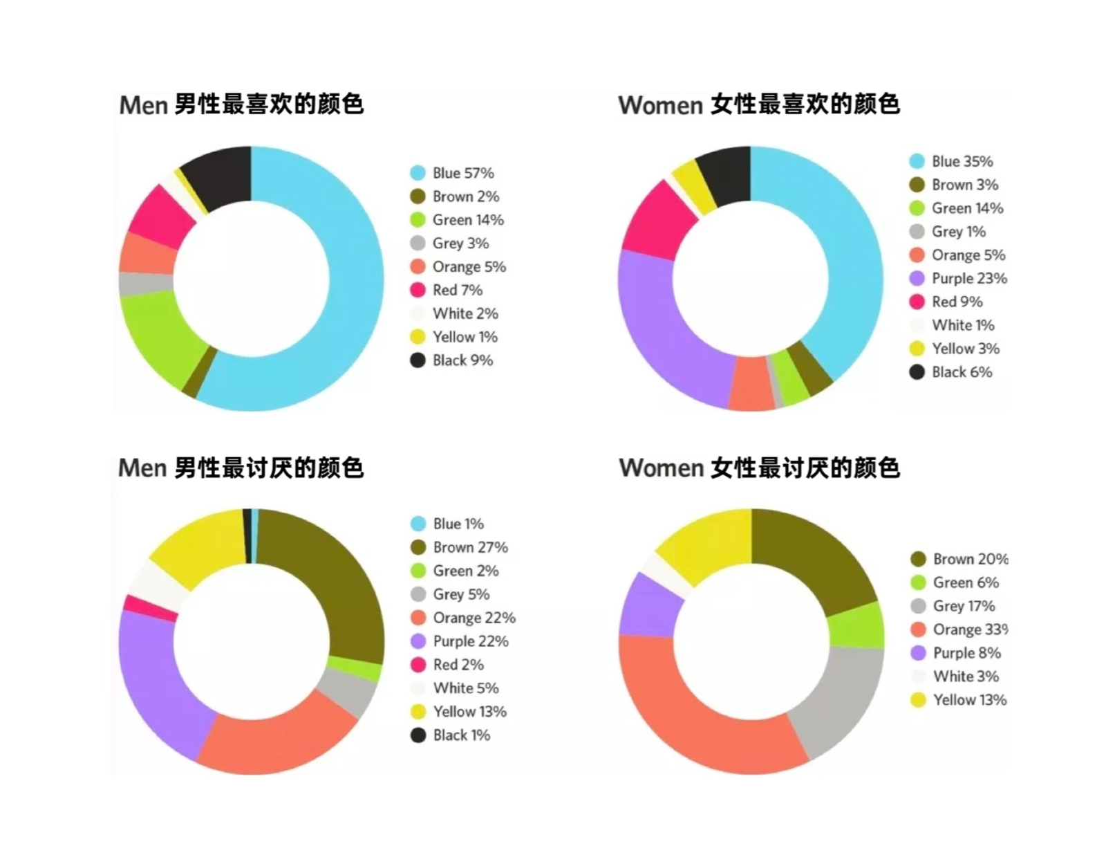 不同用户对色彩的喜好不同,不同年龄的人,男性和女性喜好的色彩都有差异。下图是国外对男性和女性喜好颜色的调查,可以发现男性通常更喜欢大胆的颜色,而女性更喜欢柔和的颜色。男性更喜欢深色的颜色,而女性更容易接受明亮的颜色。