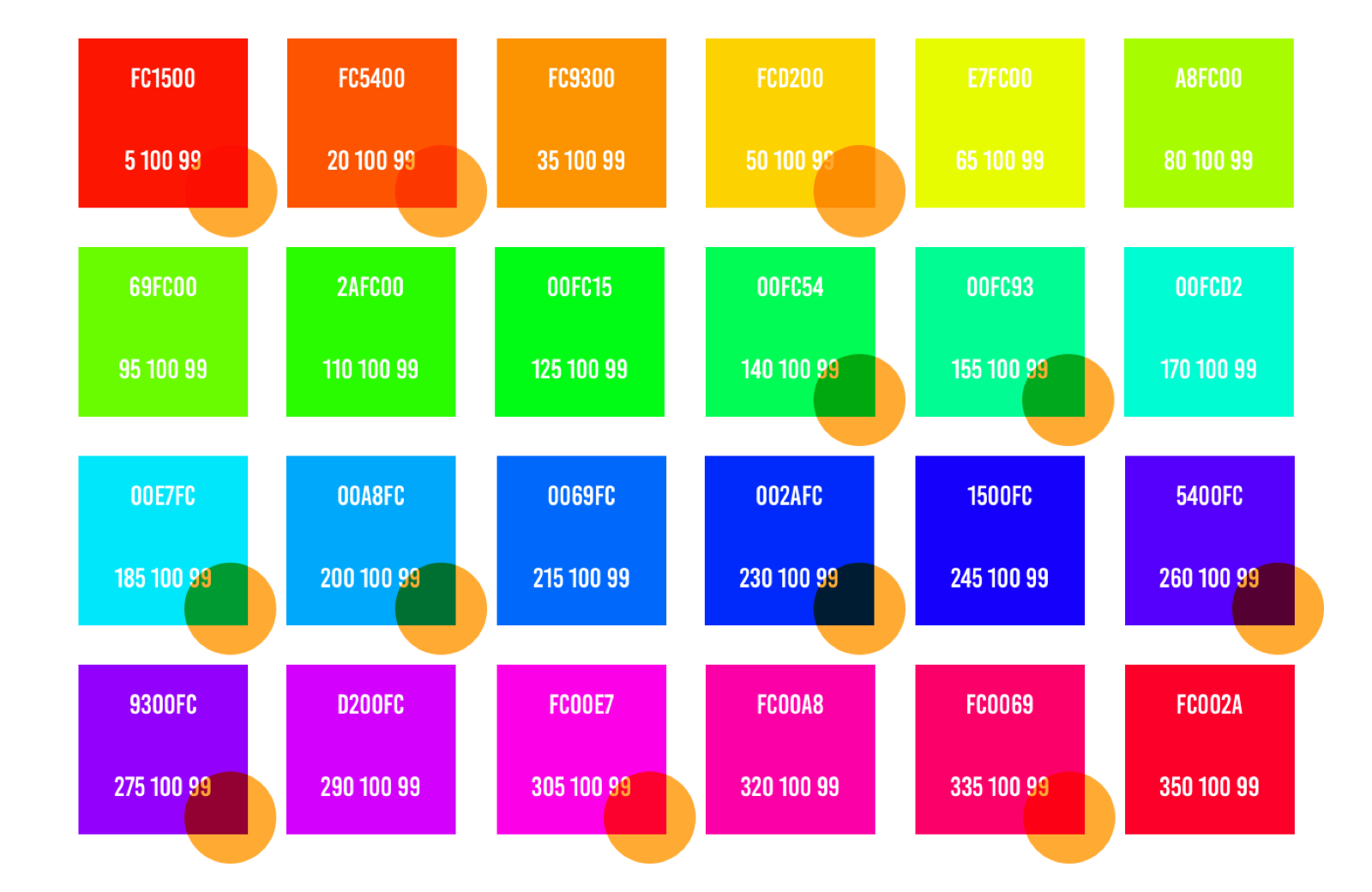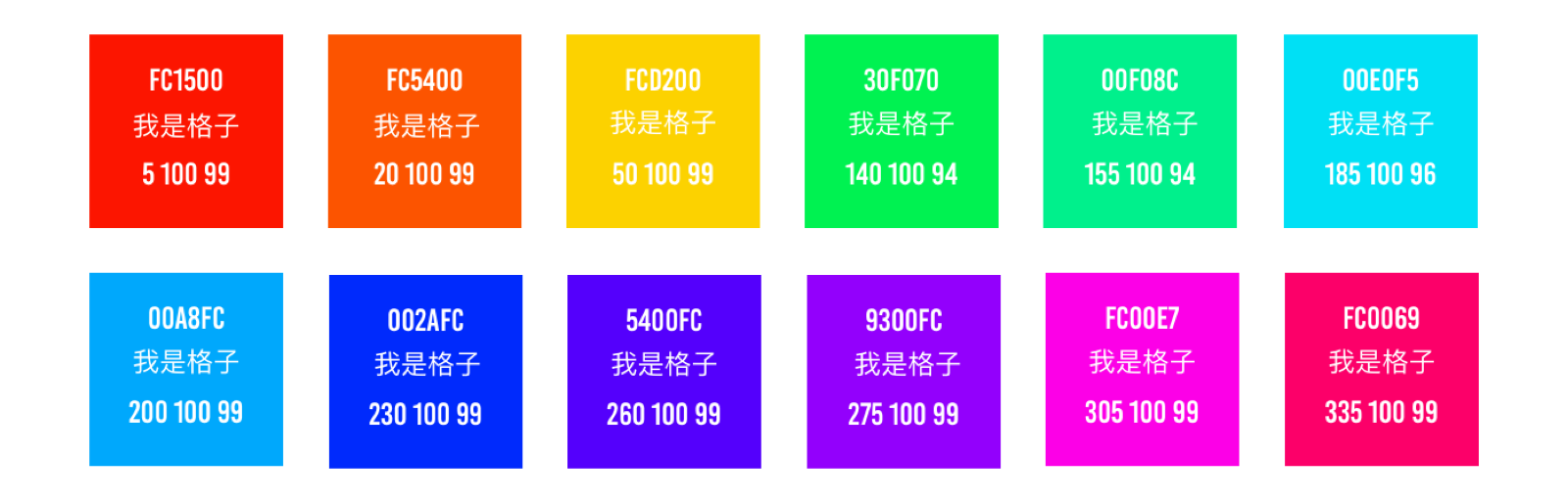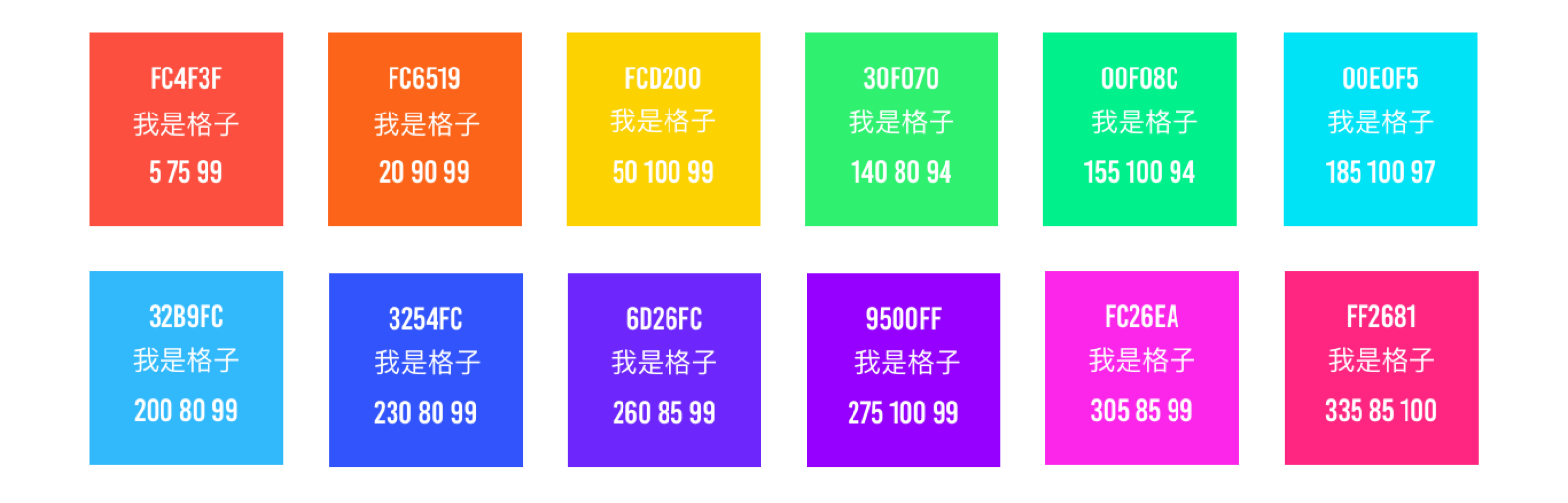 S和B保持不变,H值每15°取一个色,递增得到基于品牌色的24个色带,为什么是24个,24X15=360刚好围绕色环一圈,所以因此我们得到一圈基于品牌色,明度和饱和度一致的颜色。