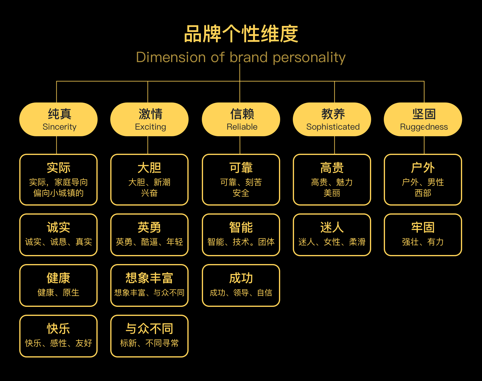 首先我们需要去确定好我们的设计目的是什么?需要给用户传达什么样的信息,是希望传达尊贵的感受,还是安全、信任感。这需要用到「品牌个性维度」度量表,这个度量表是由美国著名学着珍妮弗·阿克尔1997年第一次提出,,当时是以西方著名品牌为研究对象,发展了一个系统的品牌维度量表。