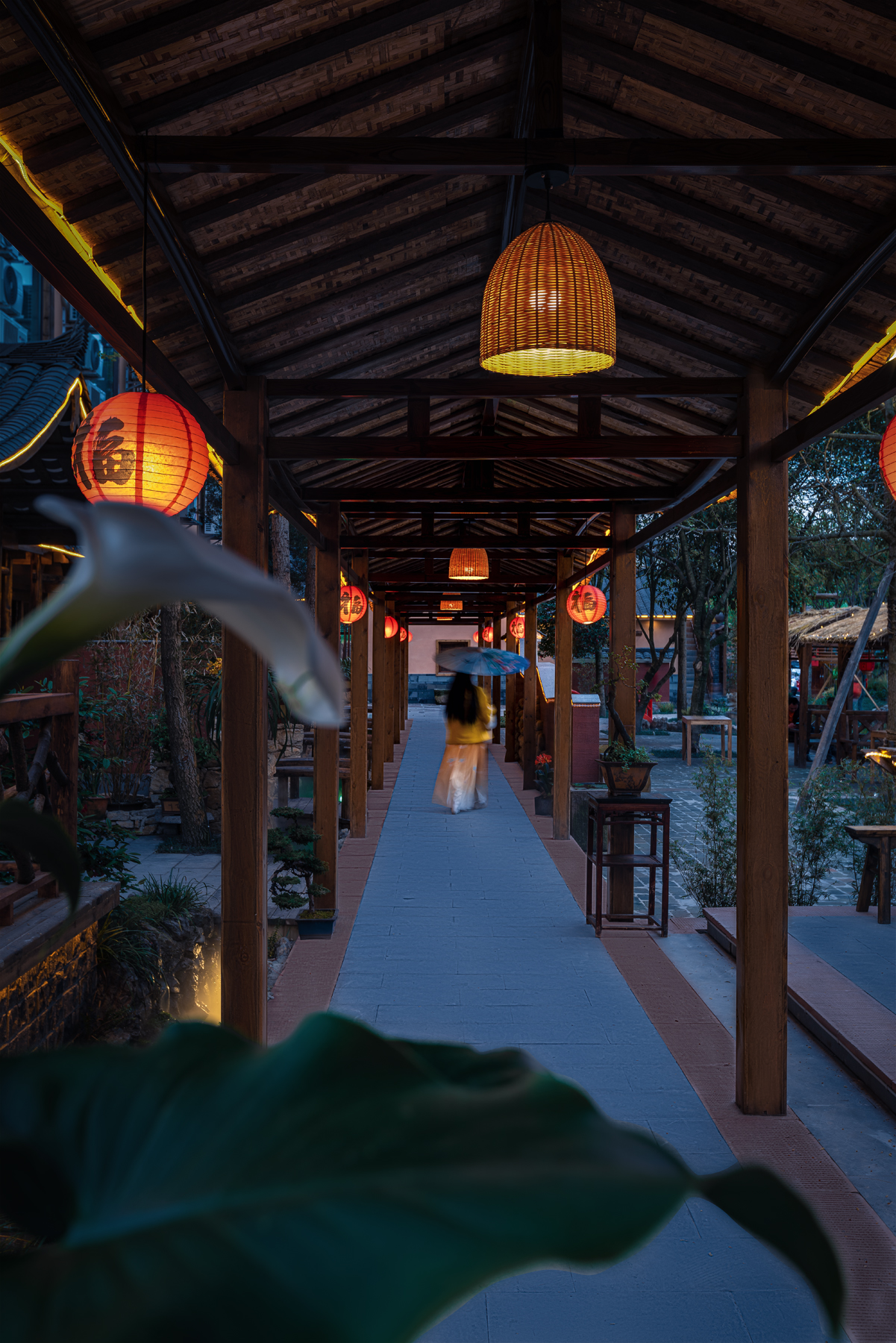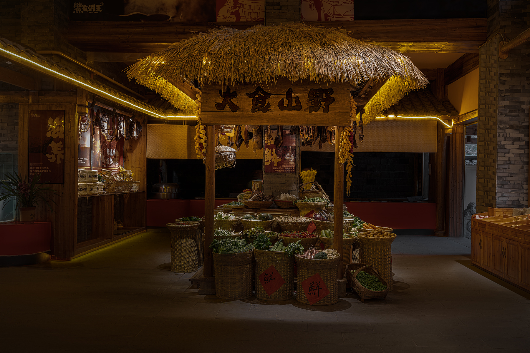 就餐空间更是一番令人心动的景象,由栅栏隔开,一排排高低错落的院落式餐座,青藤老树缠绕在栏杆屋檐之上,给人一种翻山越岭走进乡野院落的感觉。
