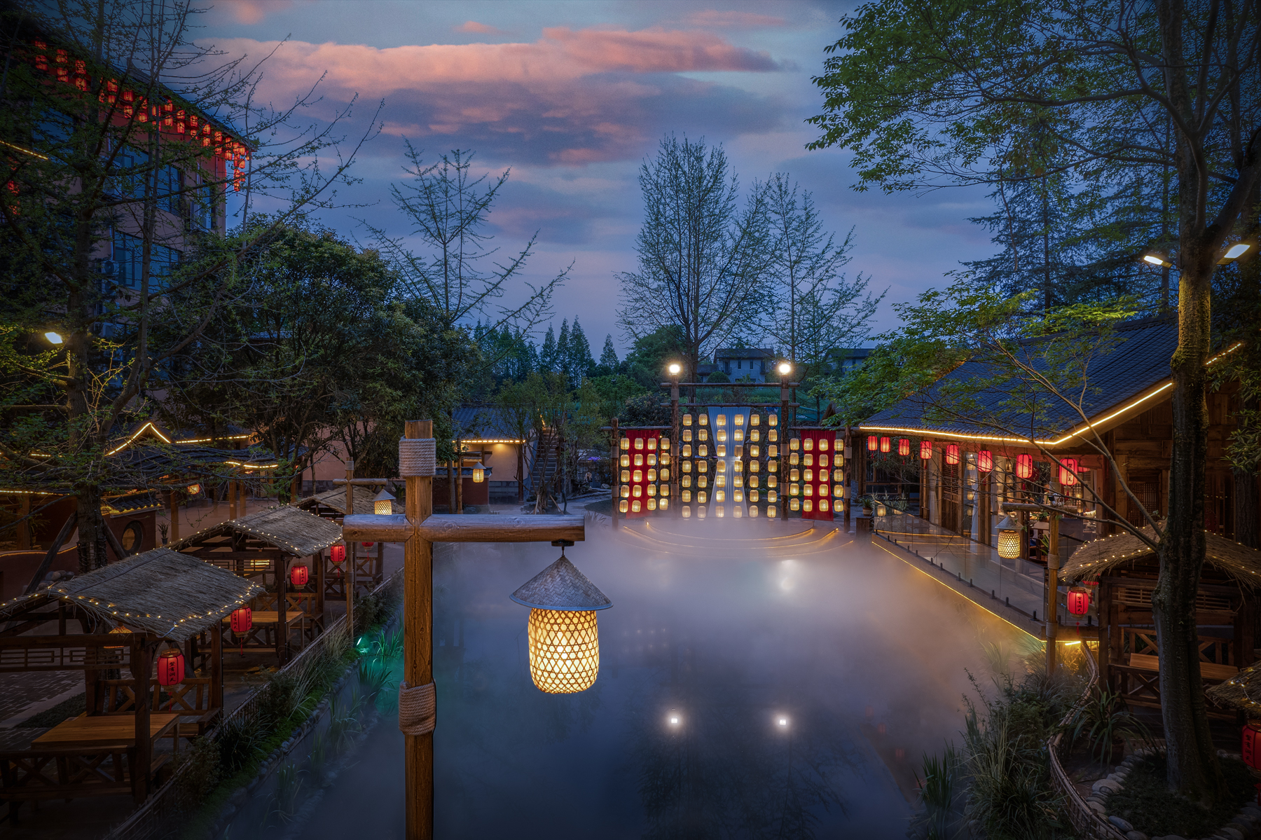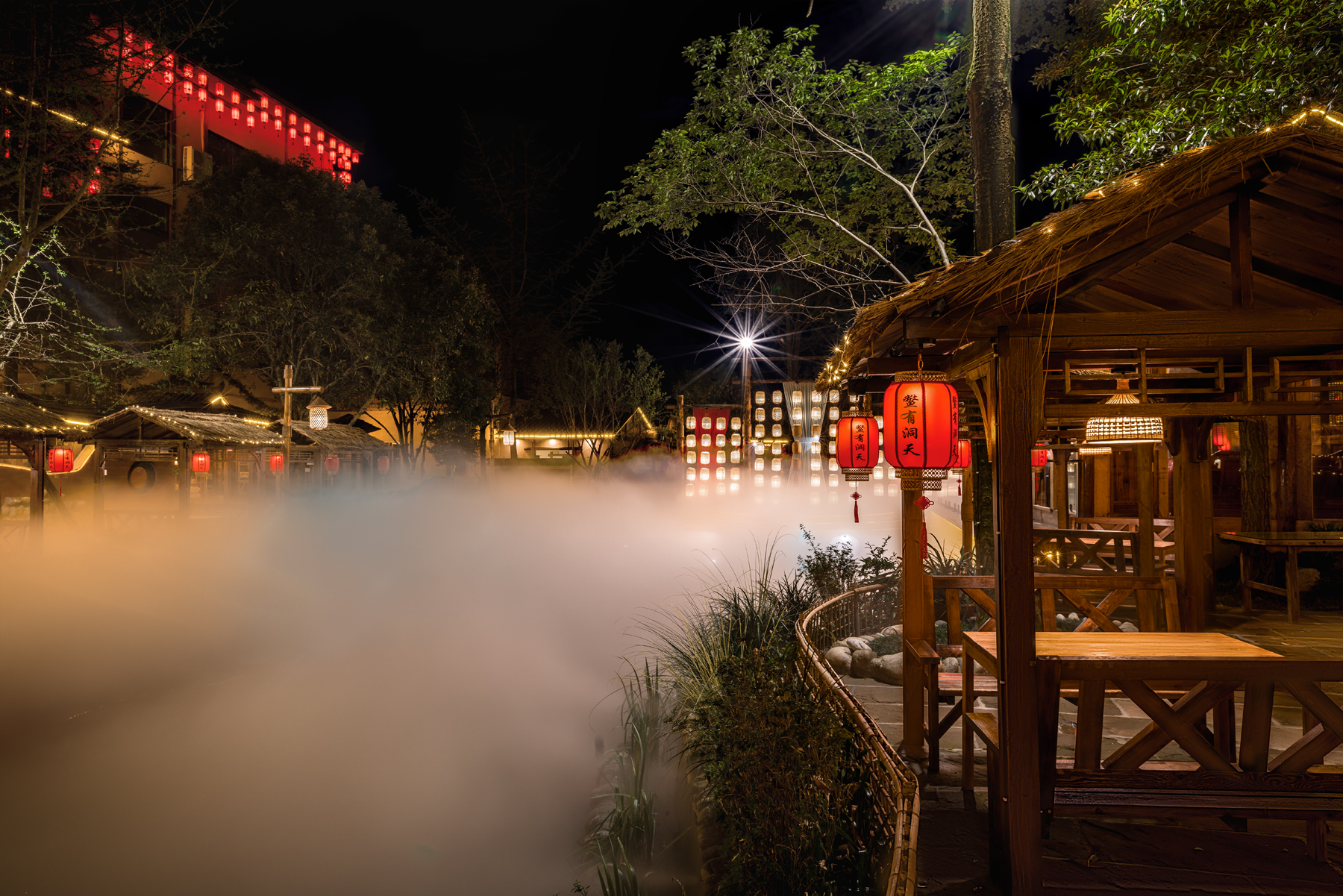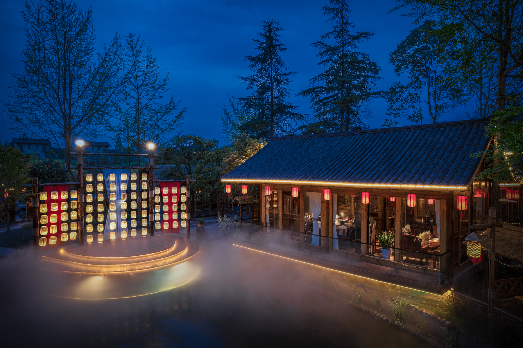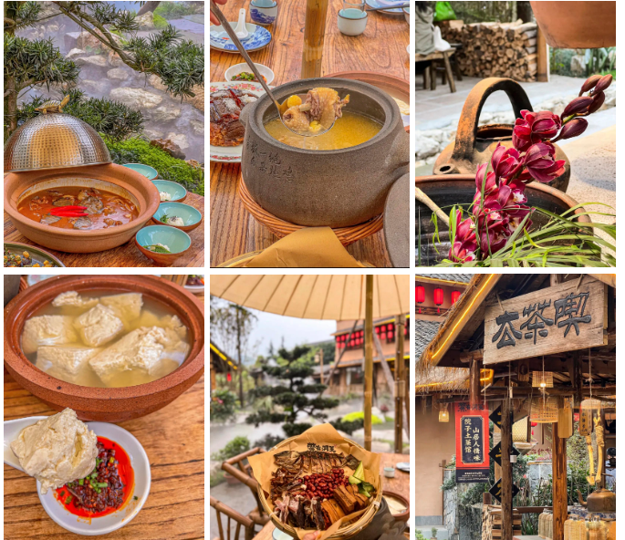 鳖有洞天有土菜佳肴与水榭楼台,有雾气氤氲在湖面,既融合了当地的烟火气,又呈现出淳朴迷人宋朝市集风貌,其间创造的多功能场景,更是让该项目一举成名,成为青城后山的网红地标打卡点。