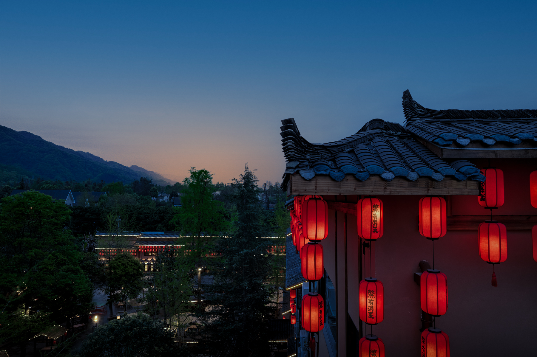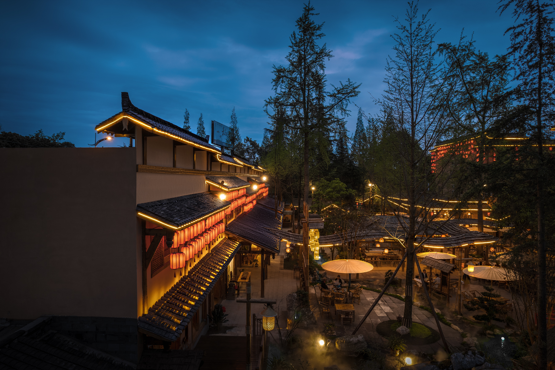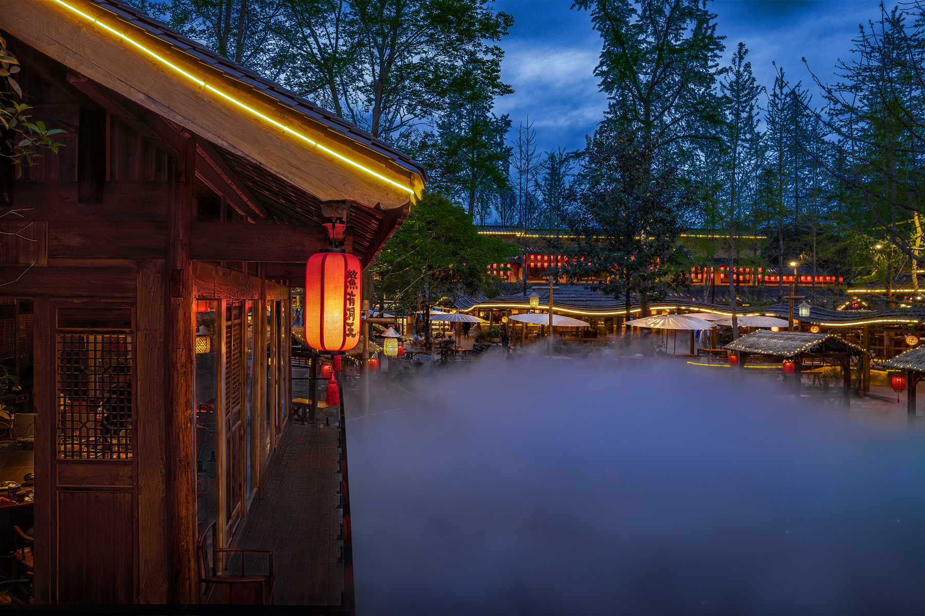 鳖有洞天有土菜佳肴与水榭楼台,有雾气氤氲在湖面,既融合了当地的烟火气,又呈现出淳朴迷人宋朝市集风貌,其间创造的多功能场景,更是让该项目一举成名,成为青城后山的网红地标打卡点。