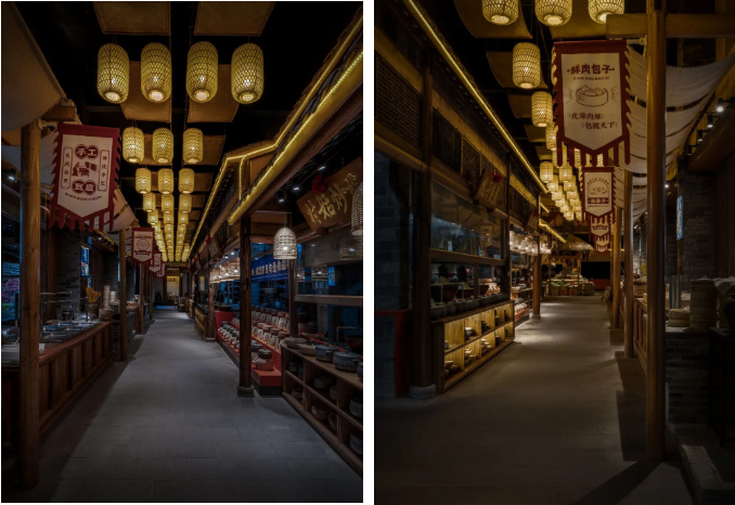 本案设计中,万境壹空设计团队利用自然资源、古旧器物,在地人文,在强调文化传承与生态内涵的同时,将《清明上河图》的价值精粹提炼至空间里,再现宋朝餐饮之美学。