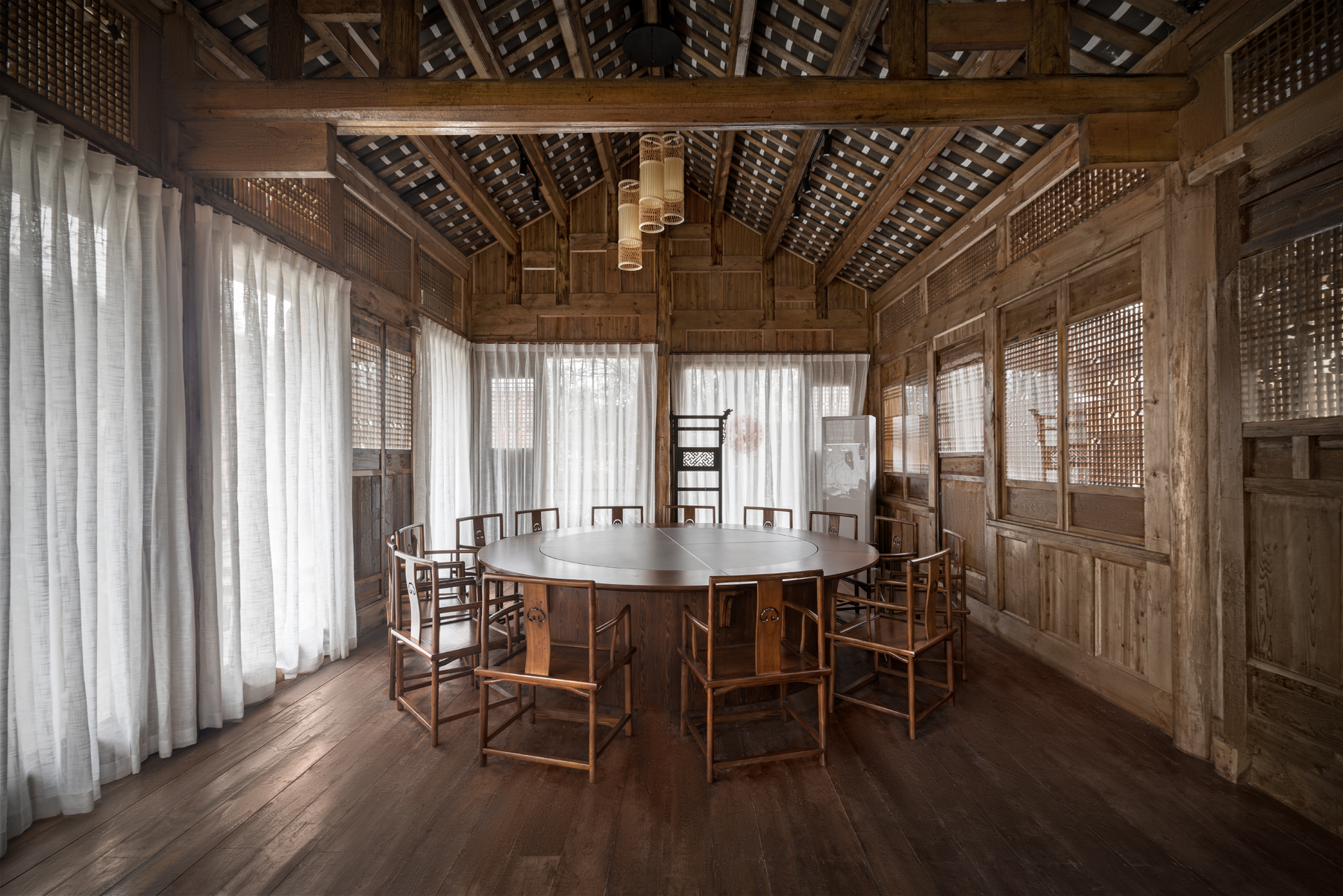 在就餐环境的氛围设计、软装选样上,万境壹空设计团队煞费苦心,从招牌菜——鳖的盛放道具、竹篾竹编、到古件屏风、雕花装饰等古旧器物,空间内的一窗一画、一椅一桌都是设计师精心挑选。