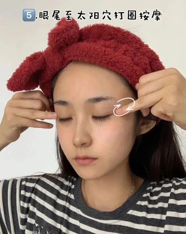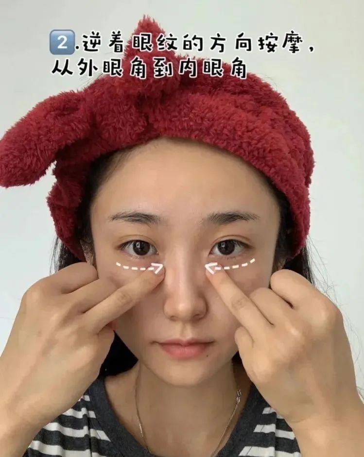 2、逆着眼纹的方向按摩,轻轻打圈直至吸收,眼下从外眼角到内眼角按摩。