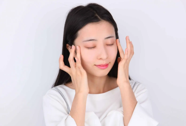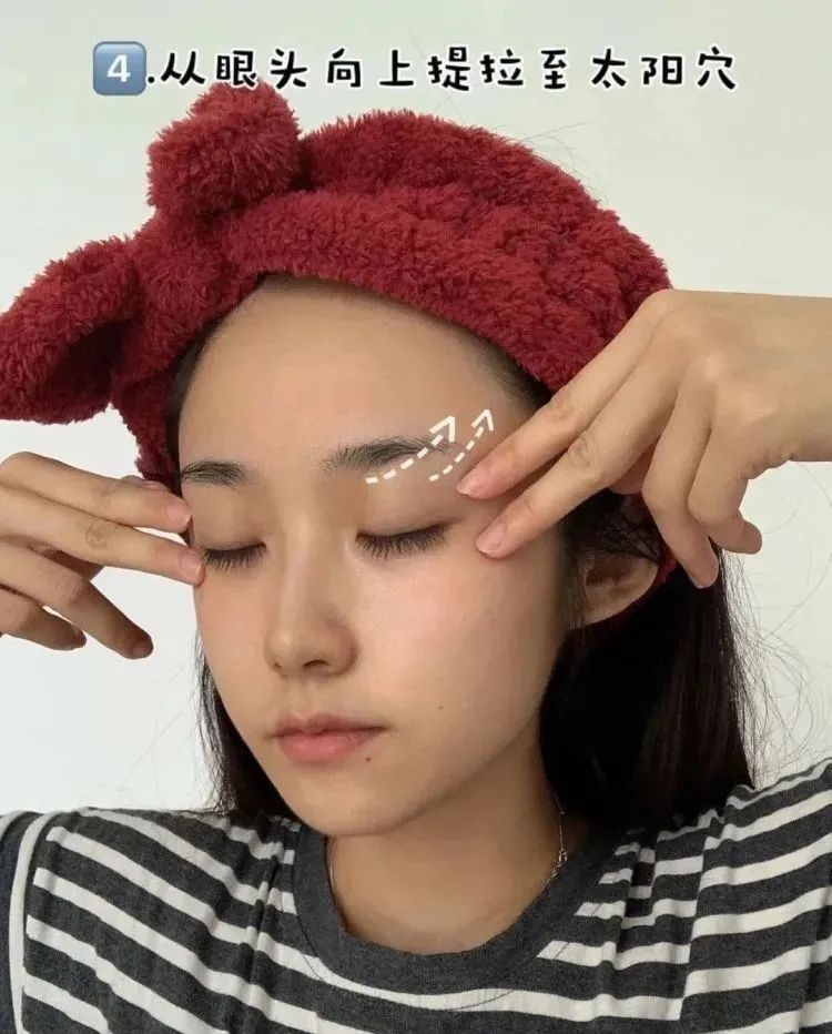 4、中指和无名指,从眼头到太阳穴重复提拉按摩。