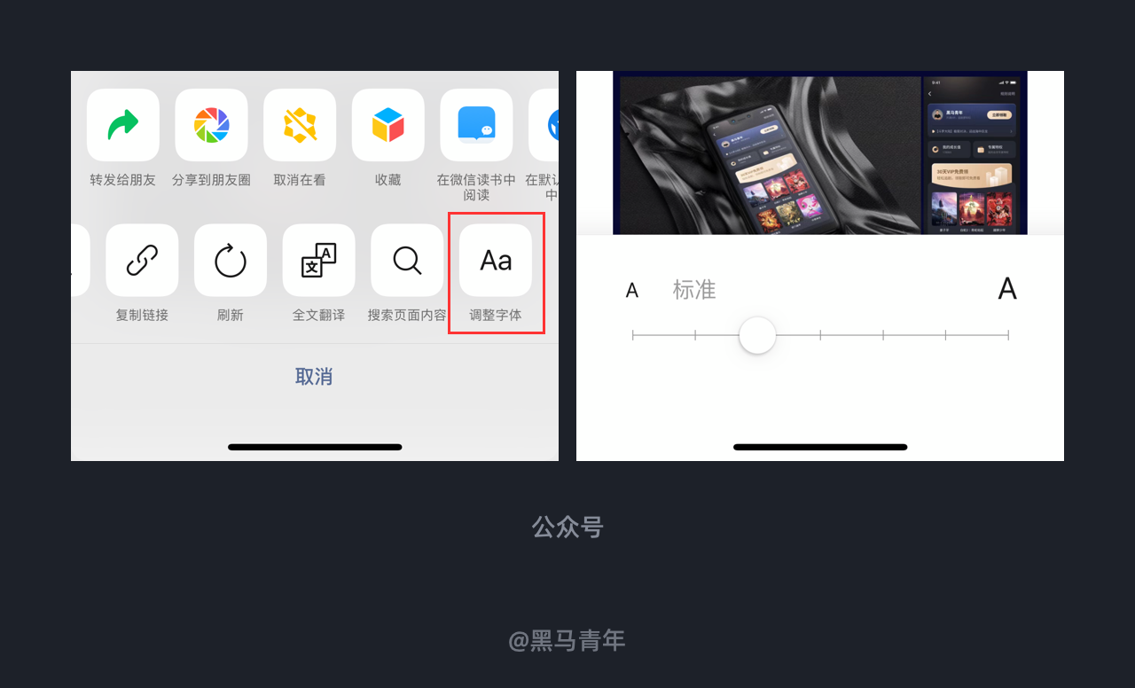 在公众号阅读文章时,可以通过右上角的功能入口进入“调整字体”。用户可以根据自己的阅读习惯设置字体大小,在标准和自定义大小之间切换,提高用户的阅读体验。