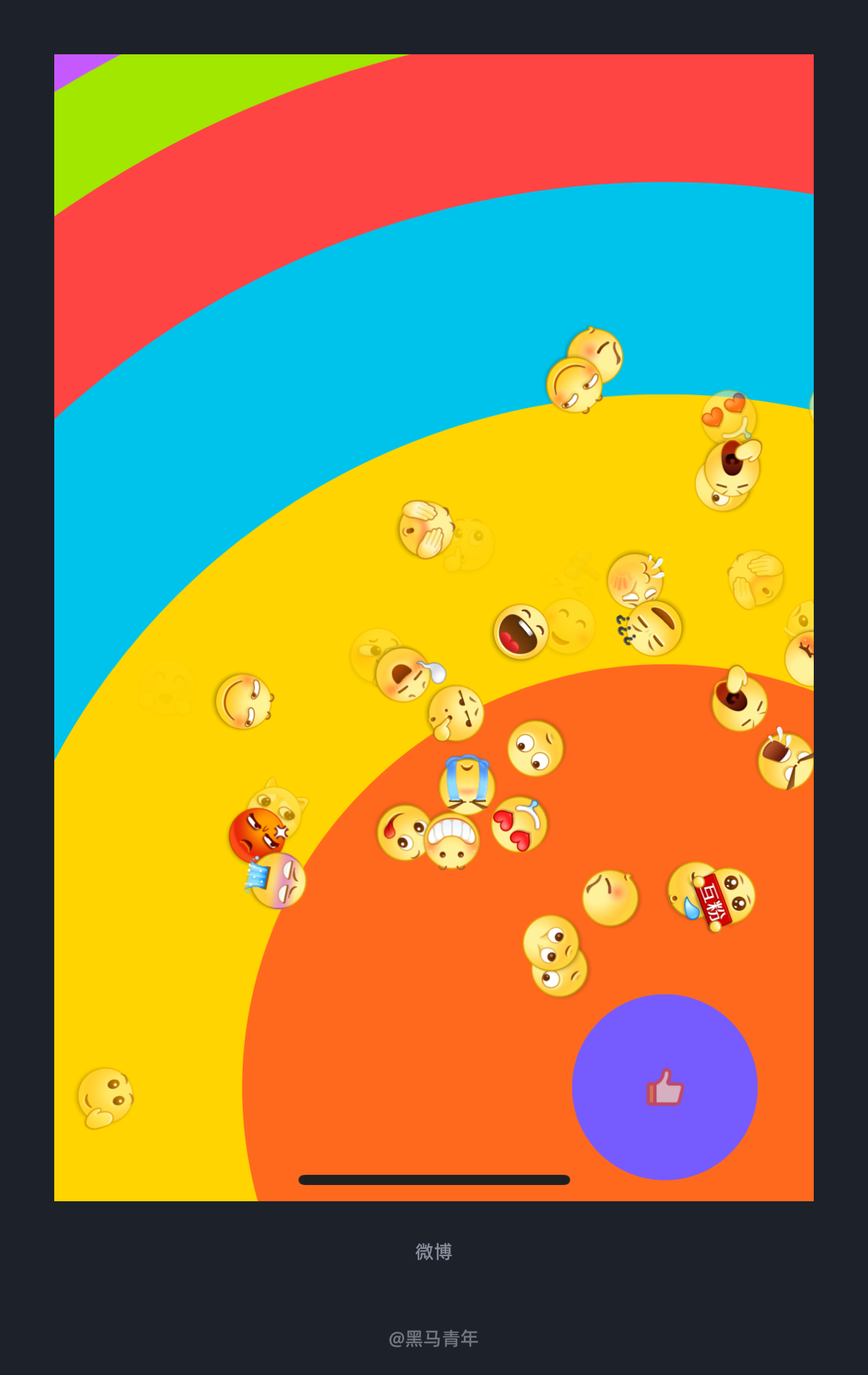 微博 APP 针对点赞设计单击时,出现表情化的符号弹出,持续点击或者长按点赞图标则会出现色彩丰富、表情符号四处爆发的视觉效果。一场趣味性爆满的视觉盛宴,满足用户释放情绪的最大化需求。