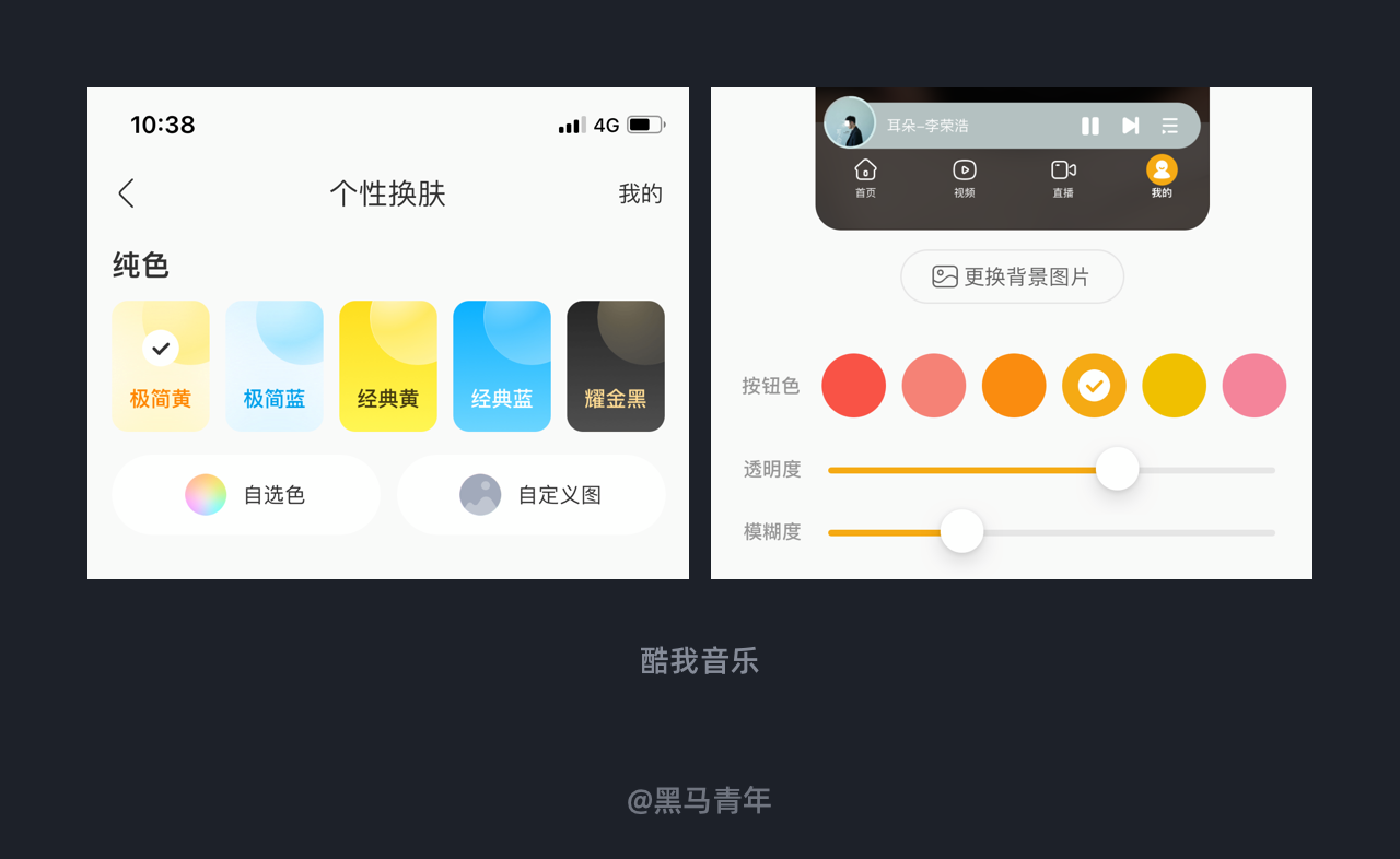 酷我音乐 APP 在个性换肤模块中,用户可以通过“自定义图”实现更加个性化的皮肤。用户可以选择任意拍摄的照片,然后通过透明度和模糊度来调节照片效果,满足自己对背景效果的要求。针对按钮的颜色也提供了几个配色选择,用户可以根据自己调节后的背景效果进行搭配。基于更加个性化的需求满足用户的创作欲,才能带给用户更加人性化的使用体验。