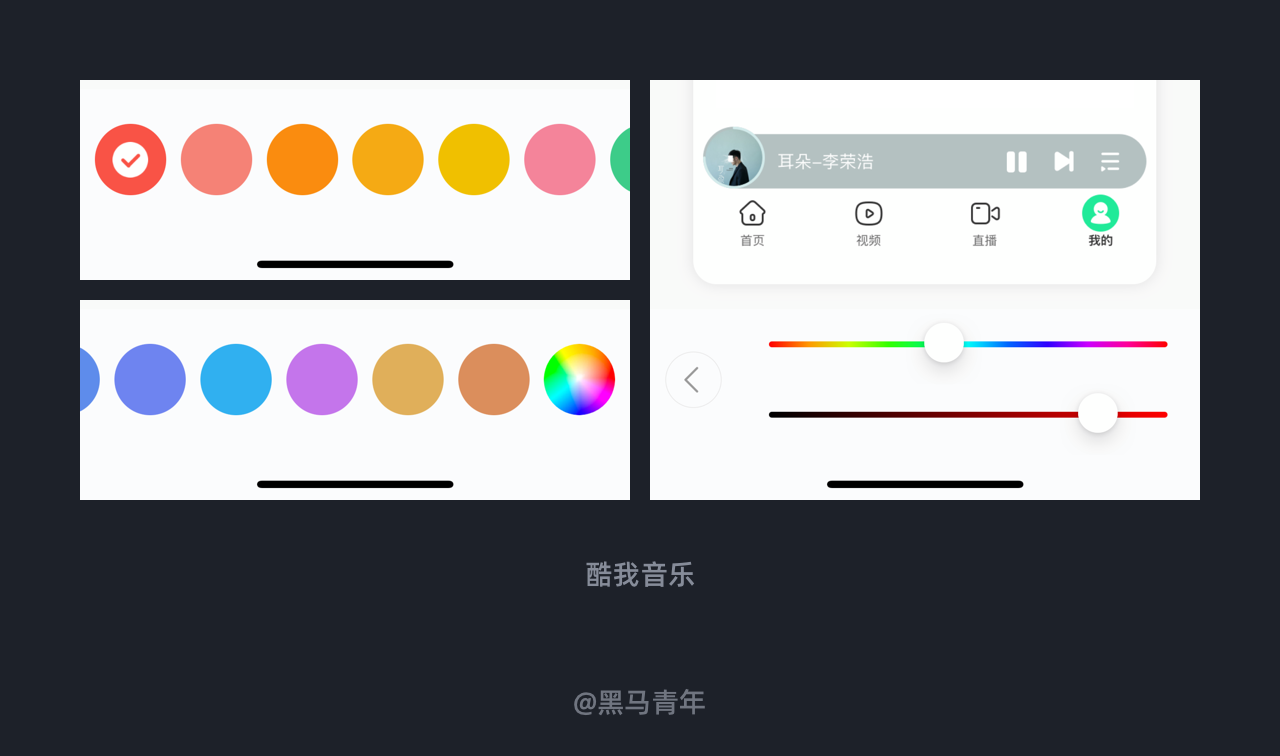 酷我音乐 APP 在个性换肤模块中,除了设置多个主题皮肤供选择以外,用户还可以通过自选色设置更加灵活的配色风格。可以选择更多推荐的配色风格,也可以通过色环自己调节任意颜色,满足不同用户对于感官体验的需求。
