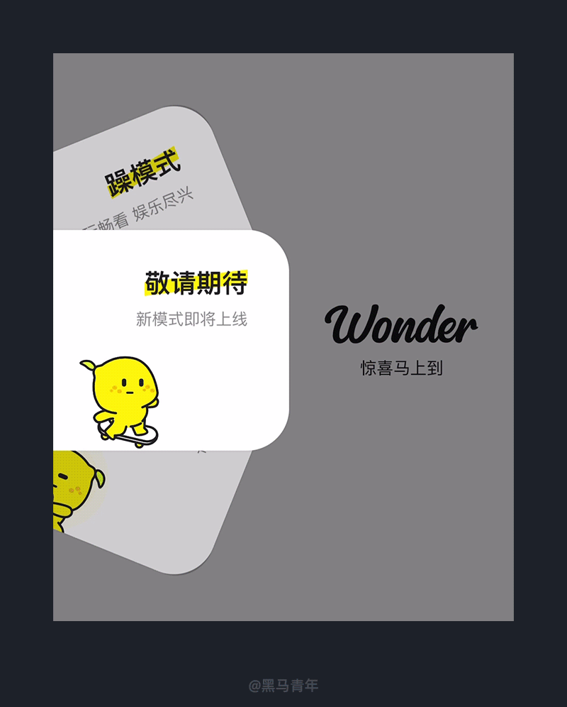 Wonder APP 在模式切换上做出了一个新颖的设计解决方案,通过环形卡片设计进行模式切换,可以单击和滑动进行切换。动态的卡通形象增加了感官体验,流畅的卡片切换也带来了不错的操作体验,是一个在布局层、视觉感官层、互动层等方面的不错探索。
