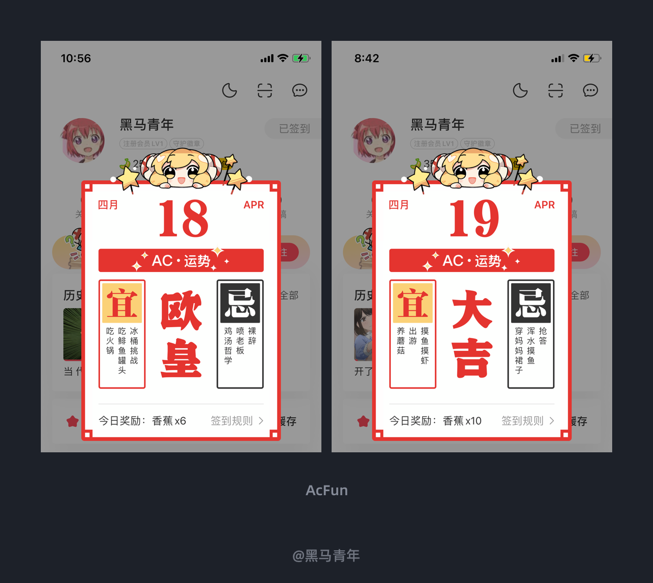 AcFun APP 将签到设计成日历展示形式,点击签到之后弹出,配合日历运势的概念来设计,提高用户的签到兴趣。内容却不是正式的日历运势相关内容,配合趣味化的文案设计,让用户会心一笑。视觉感和情感化文案设计的融入,提高了签到设计的感官体验,进而提高用户的参与度。