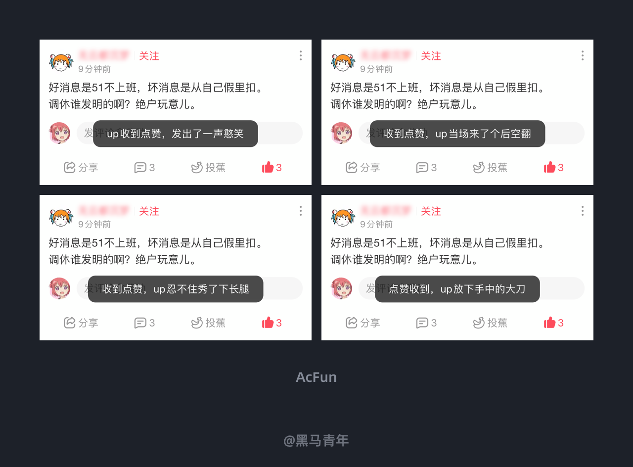 AcFun APP 在对话题等内容点赞时,会弹出温馨的文案提示,每次点赞都会出现不同的文案。情感化的文案设计提高了话题互动的活跃度,带给用户更好的社交互动体验。