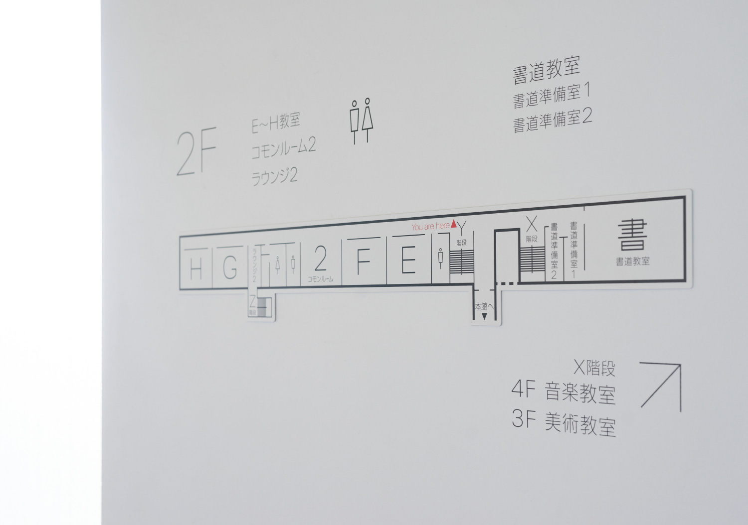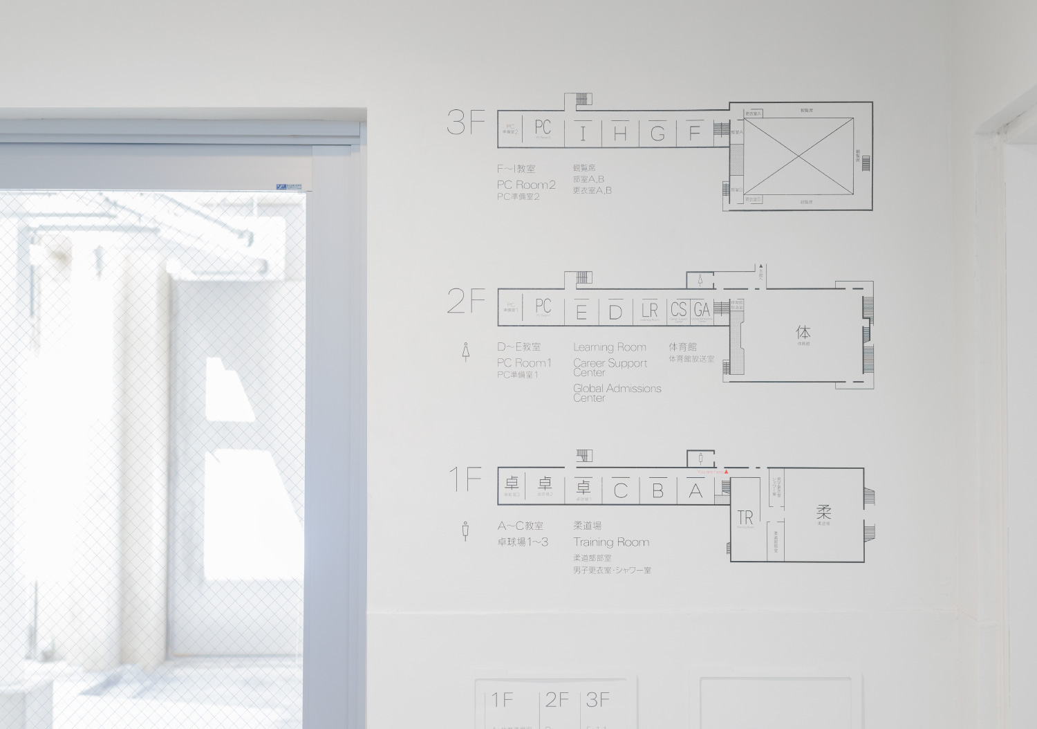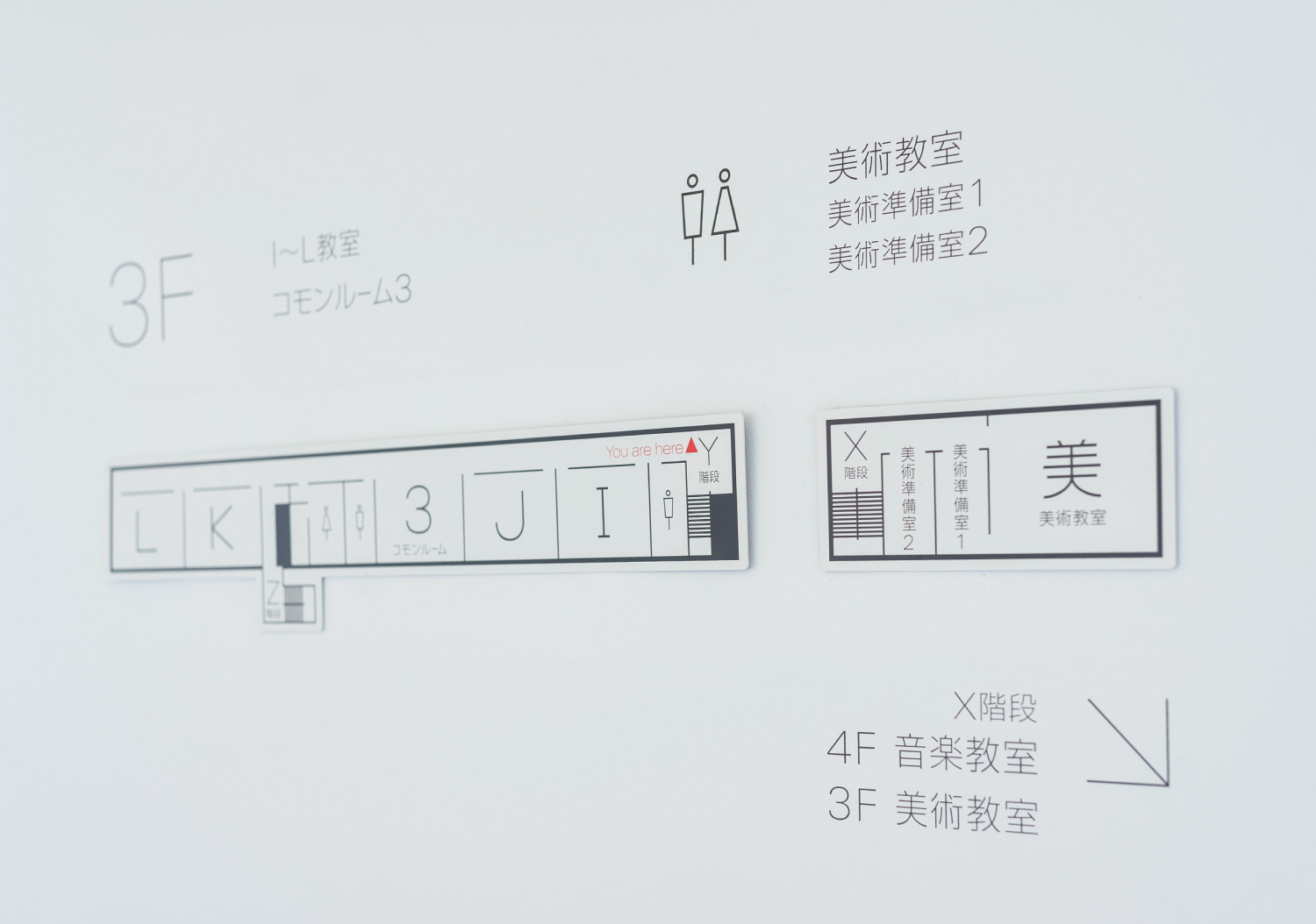 横滨高校的环境优美,建筑内饰清爽,Uji设计公司采用白色、黑色和灰色的配色,与空间相融合。纤细的字体具有美感,与木板美缝相呼应,巨大的标识使其易于辨识。楼层平面图将信息进行简化,使信息一目了然,规整的排版赏心悦目。