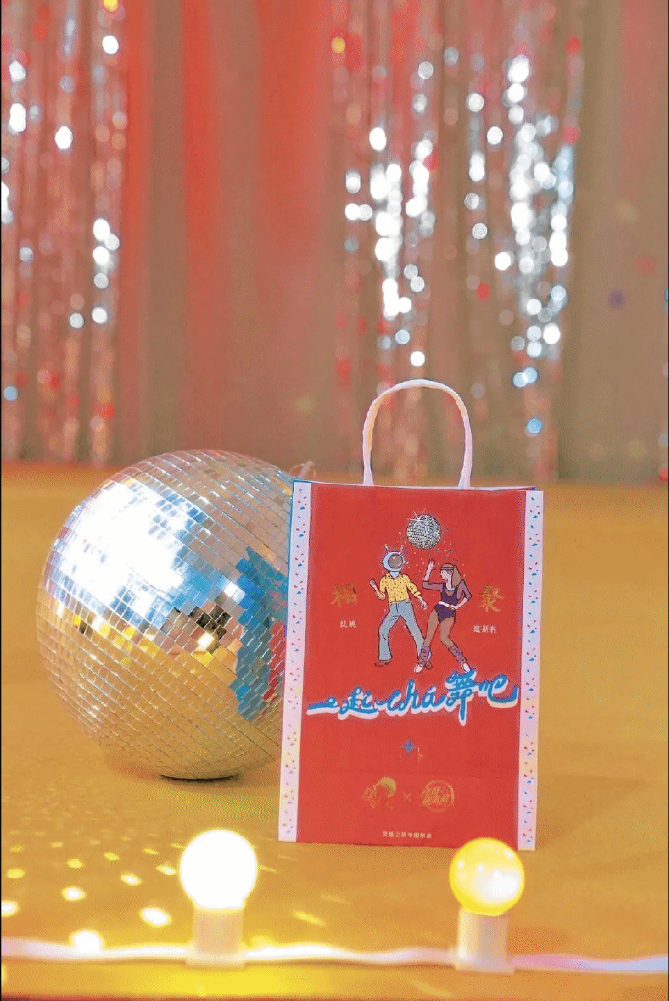 庞宽以80年代disco厅为创作灵感,融合喜茶“多肉葡萄”(郝葡萄)与庞宽机器人“艾瑞巴蒂”两大IO进行故事角色的延展,融入喇叭裤、健美服、迪斯科球、录音机与磁带等元素把大家拉回浪漫荒诞的80年代。