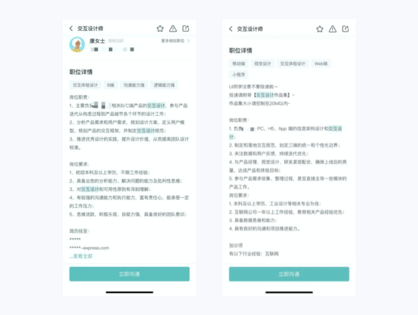 从目前的内卷程度就业大环境来讲,各个岗位的职责变得越来越交叉,对设计师的要求越来越高,交互要有一些产品思维,甚至要负责产品的一些工作;UI设计要懂一些交互方面的知识,这点我们可以看下boss直聘的岗位描述。