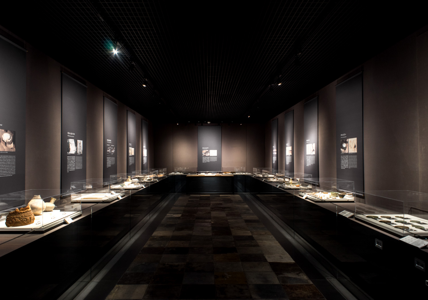 该博物馆使用投影和VR展示展品,馆内拥有随处可见的特殊建筑材料,设计公司采用黑白配色,根据最新考古发掘的结果设计了新的介绍面板,搭配图片和文字解说。特别的是,标牌多使用挂布和独立的金属面板,有助于保护建筑内饰,便于根据展览内容进行内容更替。