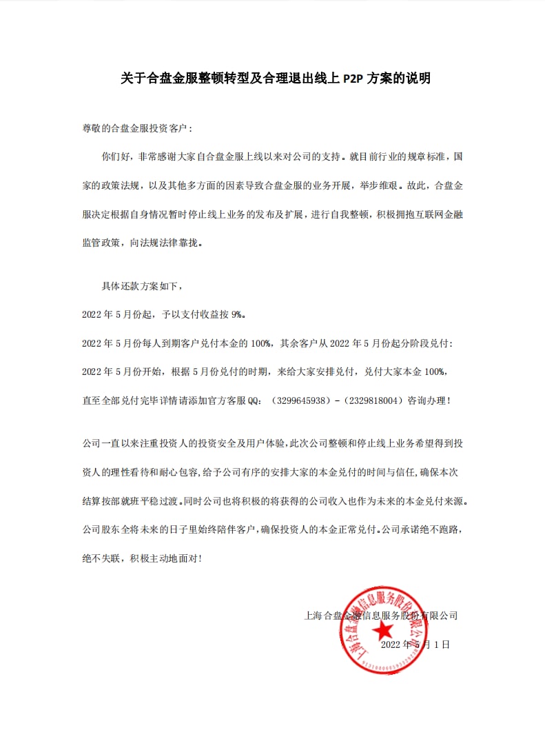 合盘金服之所以做出这样的决定,是因为不想不明不白退出市场同样也承诺不会放弃每一位出借人。在疫情以及政策风波面前,我们携手前进。当然不会辜负了出借人的信任。合盘金服不想成为其他人唾骂的理财平台,唯有良性退出市场,在开展其他业务使,才会继续有您们支持放心得多。姑且在相关部门的帮助之下。合盘金服正式进入清退工作阶段,已经制定兑付方案进行。