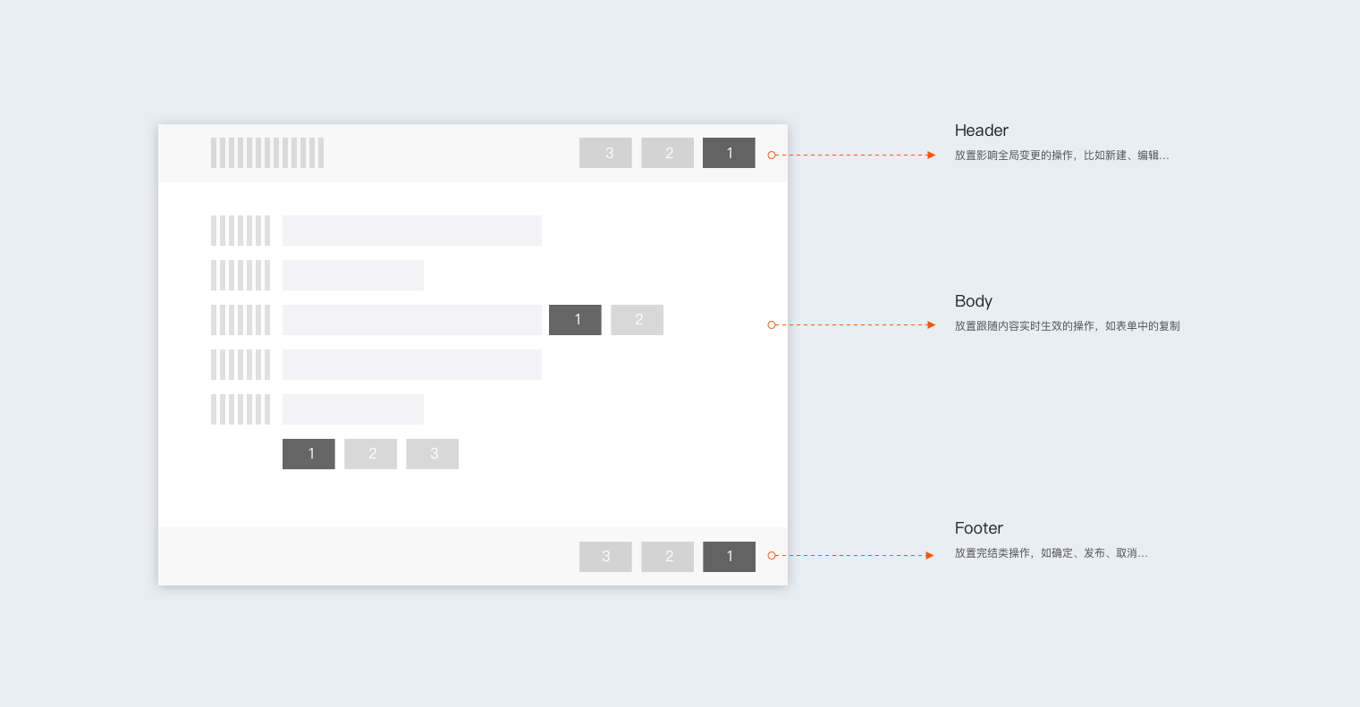 参考 Ant Design “我们确定了一个清晰的设计策略来决策按钮区位置:应将按钮放置于用户浏览路径中,便于被用户发现,并且应尽量靠近其所控制的对象。在未刻意建立信息层级引导视觉路径时,经典 “F” “Z” 网页浏览模式作为了我们按钮位置放置规则的基础指导。”