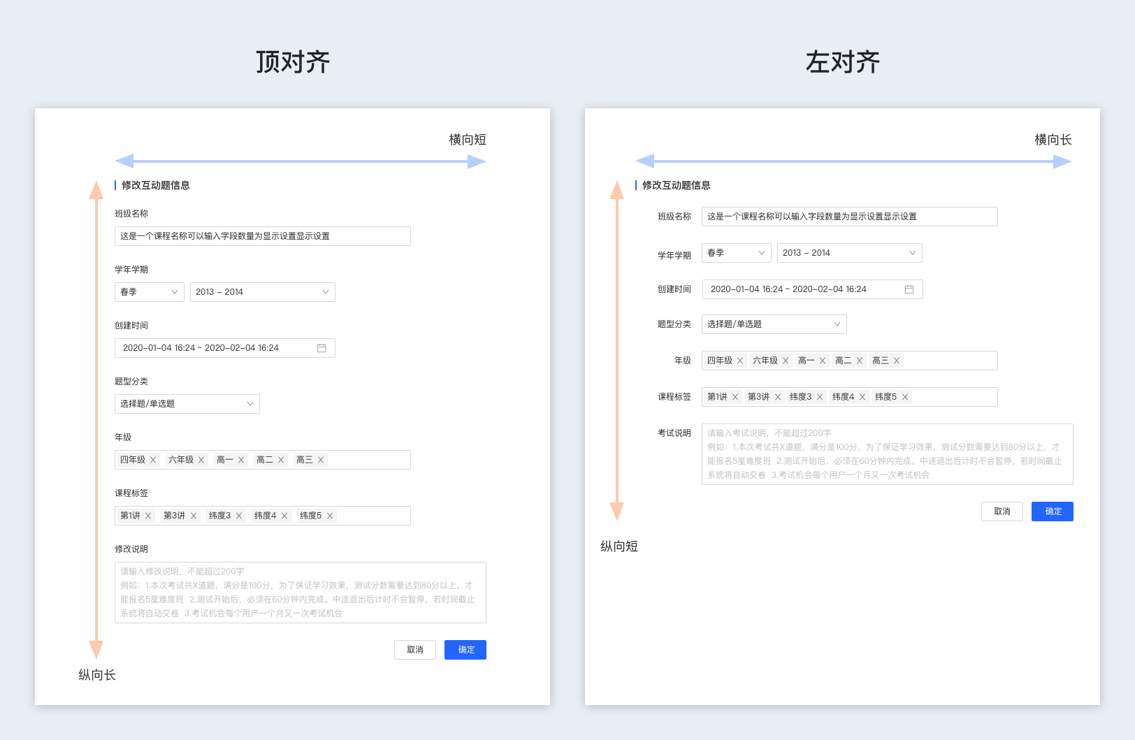 顶对齐:1. 当页面横向空间较少,比如在内容较少的弹窗、抽屉、页面分屏、页面 2. 更加聚焦填写内容,要求极高的填写效率 3. 不会因为 Lable 的长度不固定,而引起视觉不平衡,视觉上整齐统一