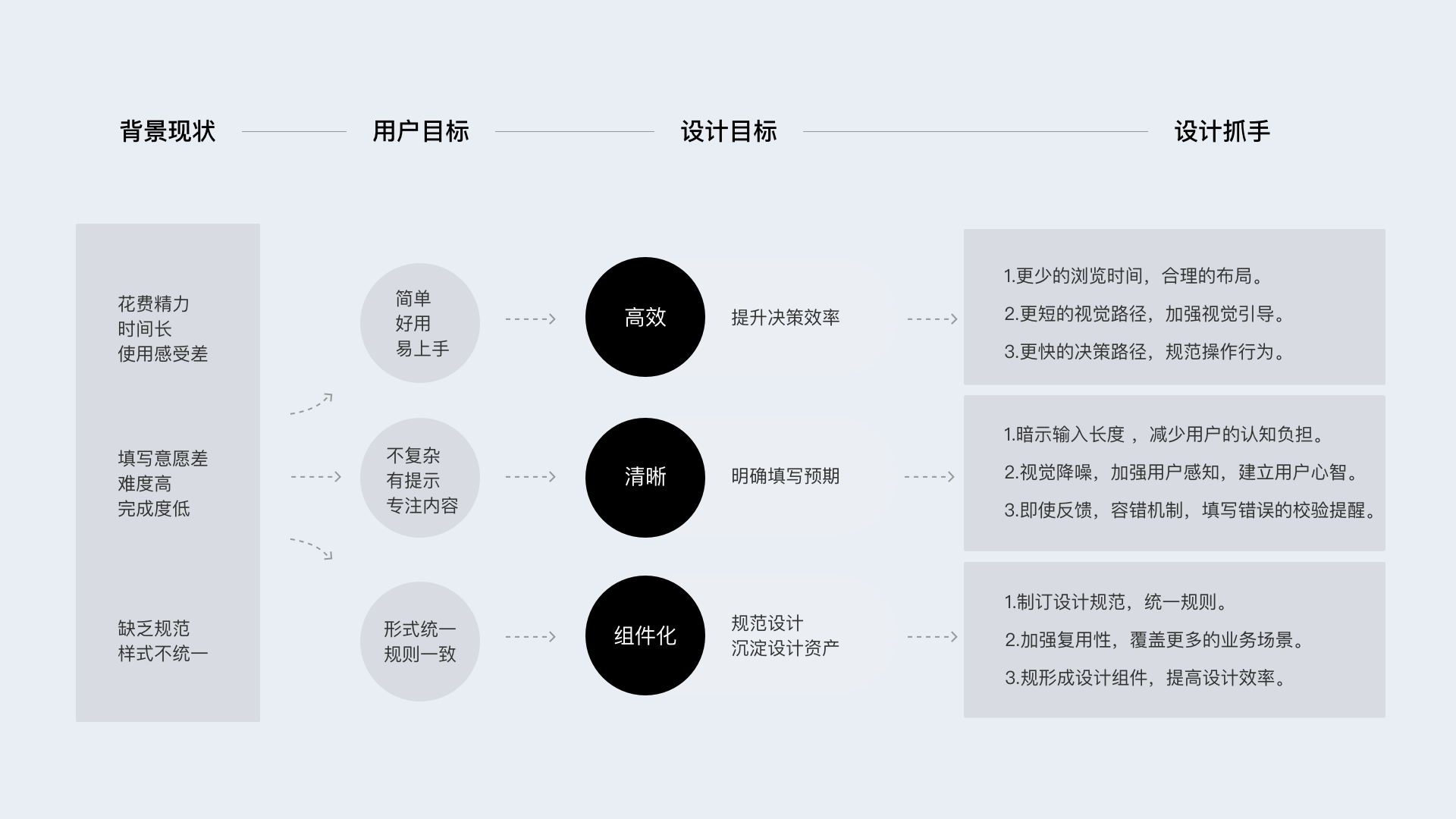 我们通过对现状的分析,结合用户调研,确定设计目标为高效、清晰、组件化,并将设计目标拆解为具体的可执行动作。