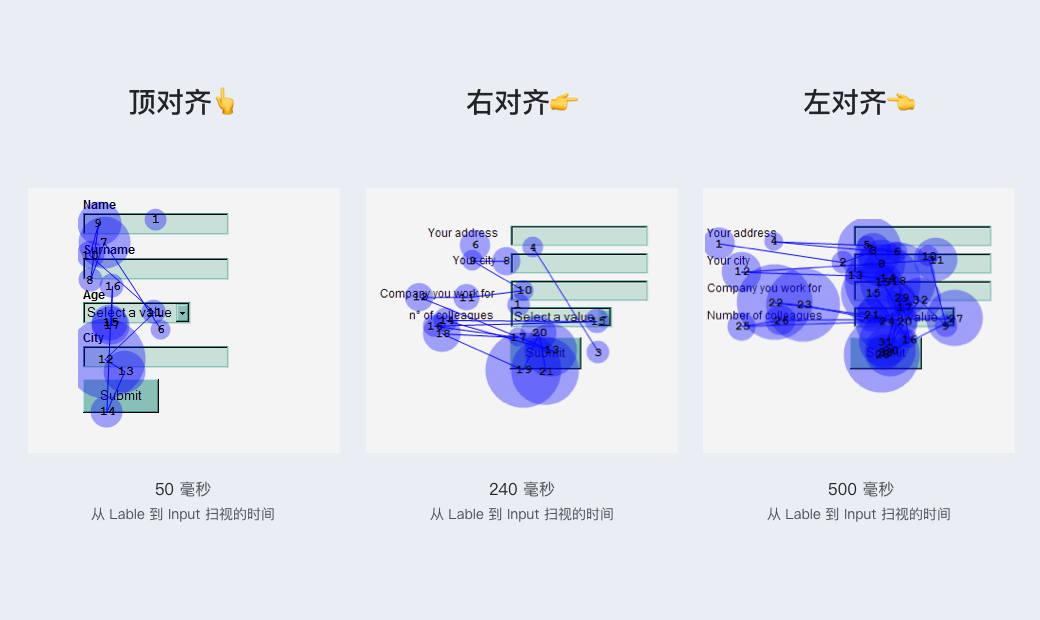 Matteo Penzo 通过眼动追踪实验的方式,对表单中 Lable 的放置位置进行深入研究。研究发现,对于用户来说,需要有一个从 Lable 到 Input 扫视的时间,来感知之间的联系。其中,左对齐需要 500 毫秒,右对齐需要 240 毫秒,顶对齐需要 50 毫秒。填写速度从快到慢依次是 顶对齐、左对齐、右对齐。