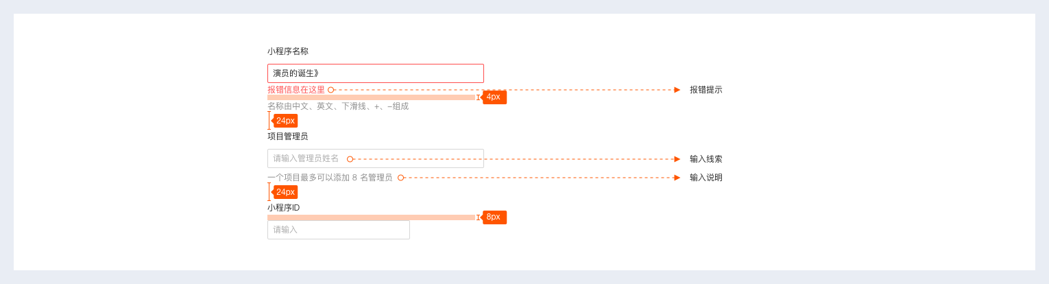用户在初次使用表单时,对各种定义、用途、使用条件等概念往往理解不清晰。我们希望用户在填写表单时,给予用户清晰的引导和明确的填写预期。这里我们对输入说明、输入线索、错误提示进行规范。