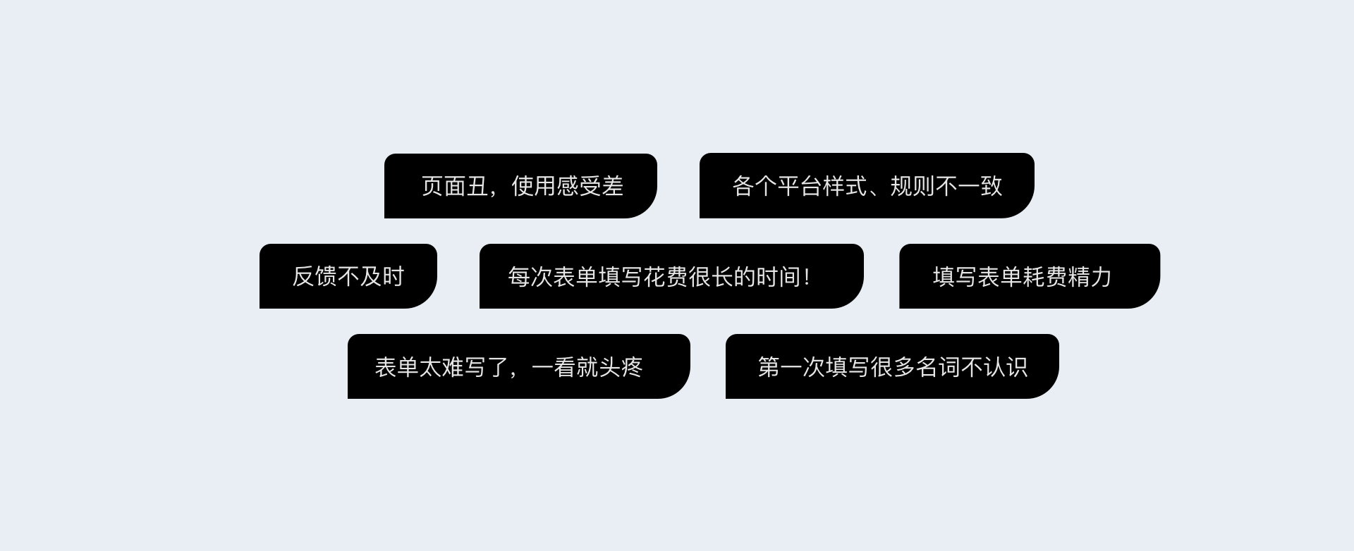 用户侧:在过往的工作中,我们通过对用户调研,并对反馈进行整理。发现用户对表单使用问题集中表现为使用效率低,填写复杂。