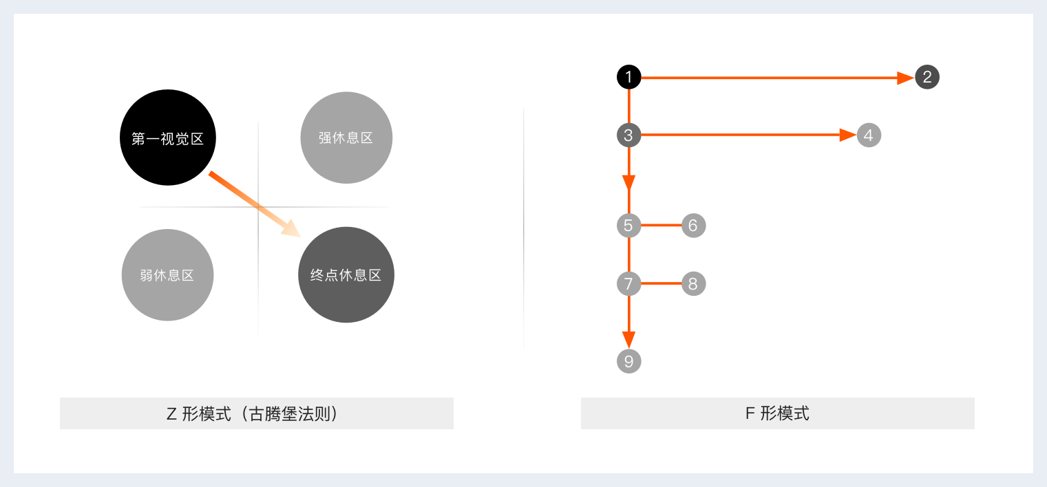 Z 字形阅读(古腾堡法则)用户关注流(通常含鼠标移动)遵循一个 Z 字形模式。视线流从左上到右下,左上角为第一视觉区,右下角为视觉终点区。