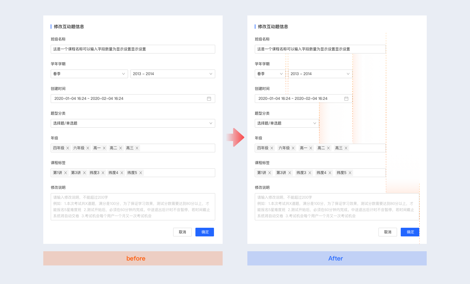 小结:我们根据此规范,对真实使用场景做优化,有较为显著的提升效果。在满足填写需求的同时,我们也通过设定的 Input 尺寸,给予用户所输入内容长短的心理预期。与表单自适应规则不同,Input 定宽的处理方式可以降低适配过程中的视觉风险。同时,错落有致的布局,更接近真实的使用场景也符合设计美感。
