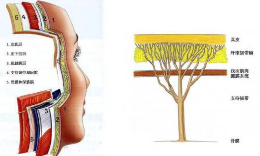 首先,我们先了解一下人体的面部结构是什么样的?人的脸从外向内的结构分别为:皮肤、皮下组织、肌腱腱膜层以及韧带和韧带间隙、骨膜、骨头。