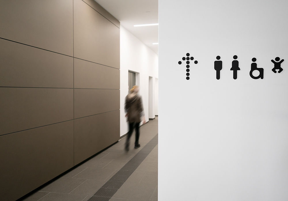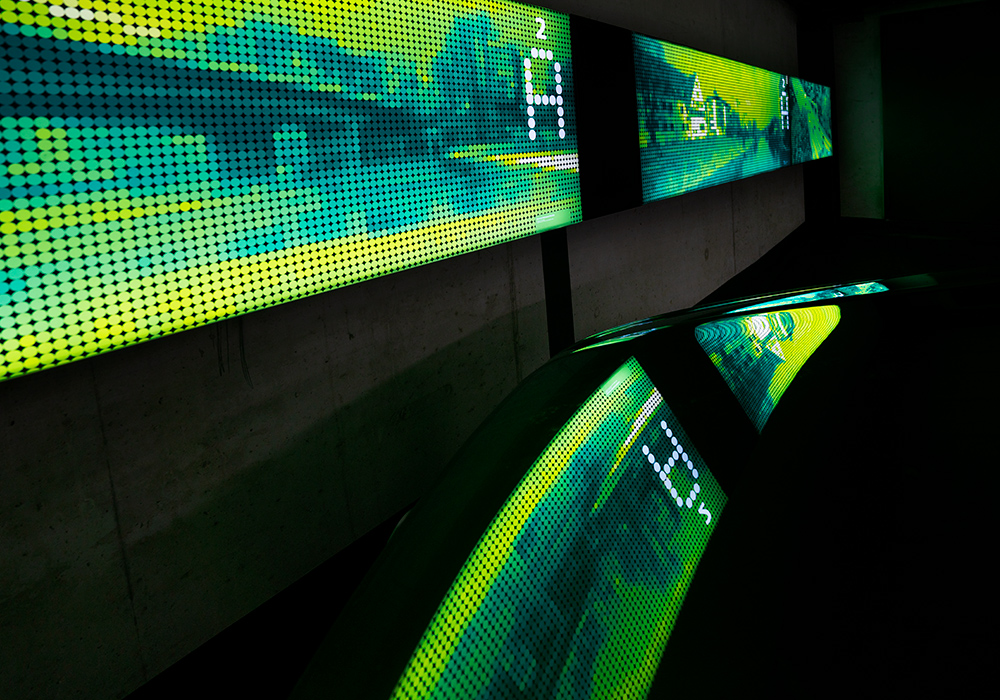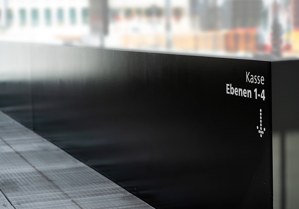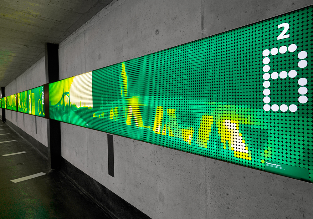 由于乌尔姆火车站停车场的内饰为圆柱形灯,braun engels设计公司设计了波点构成的icon和编码,标牌面板为波点网结构,内部采用灯光照明,便于内部寻路。环境图形由风景图像、历史人物构成,整套导视系统传达了包容的概念。