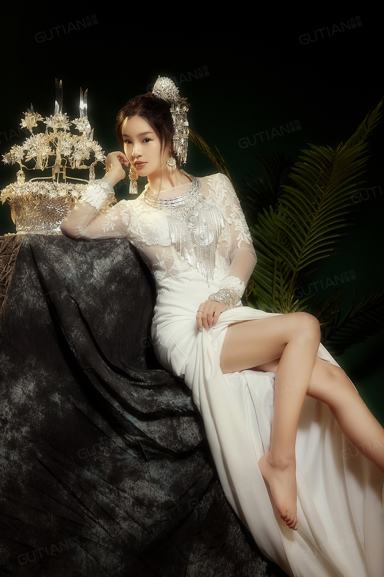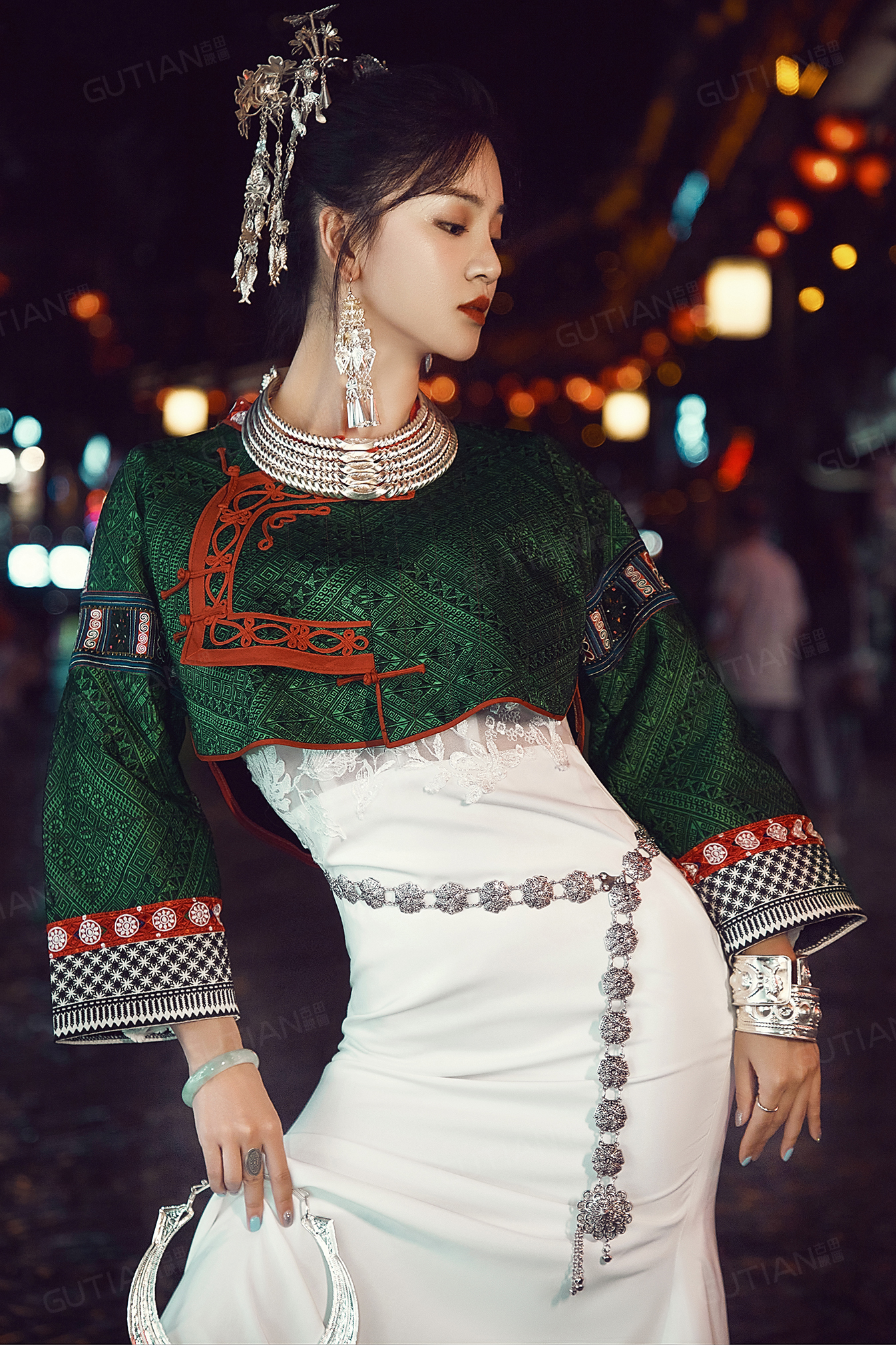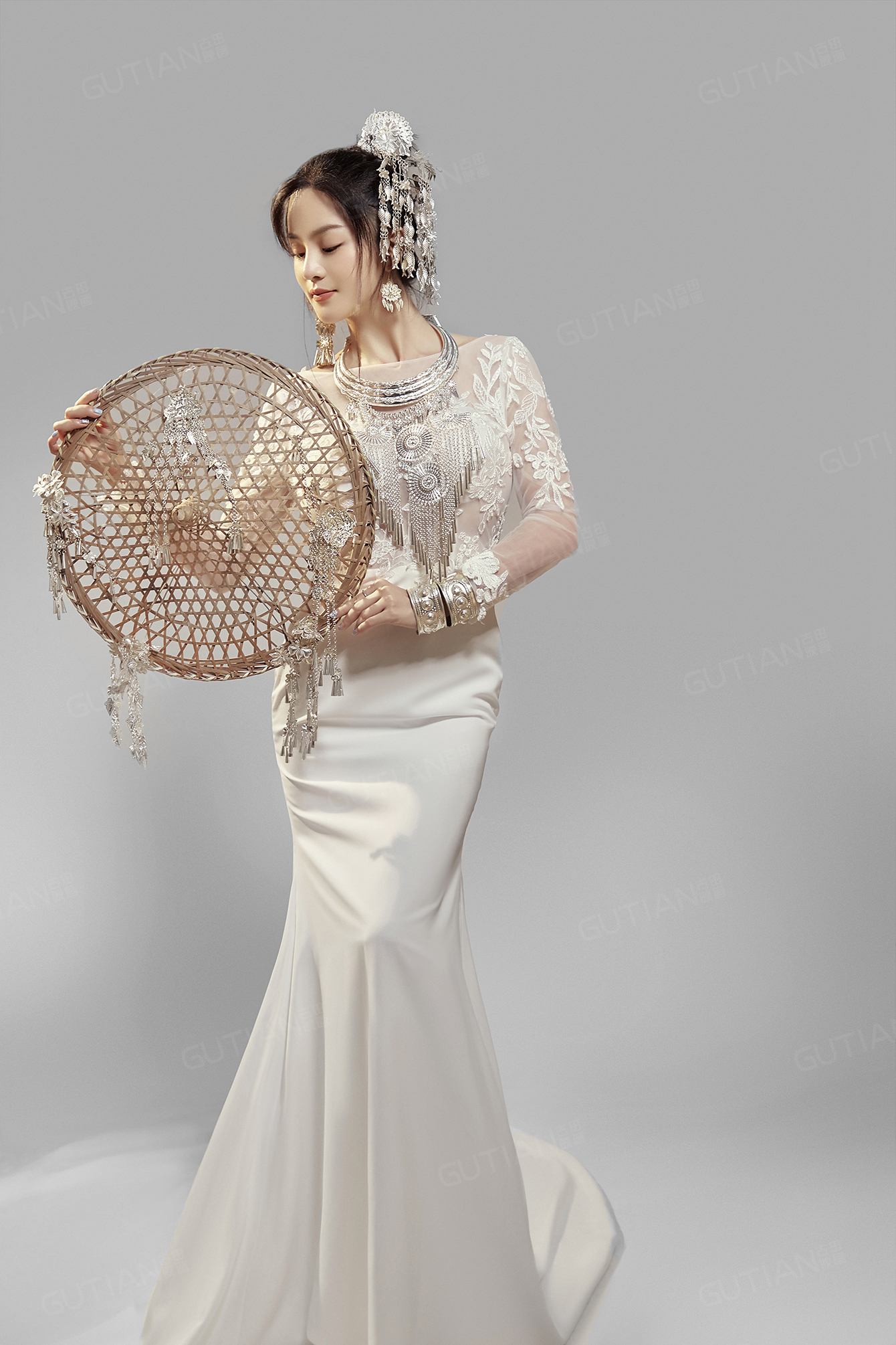 苗族银饰搭配白色修身礼服