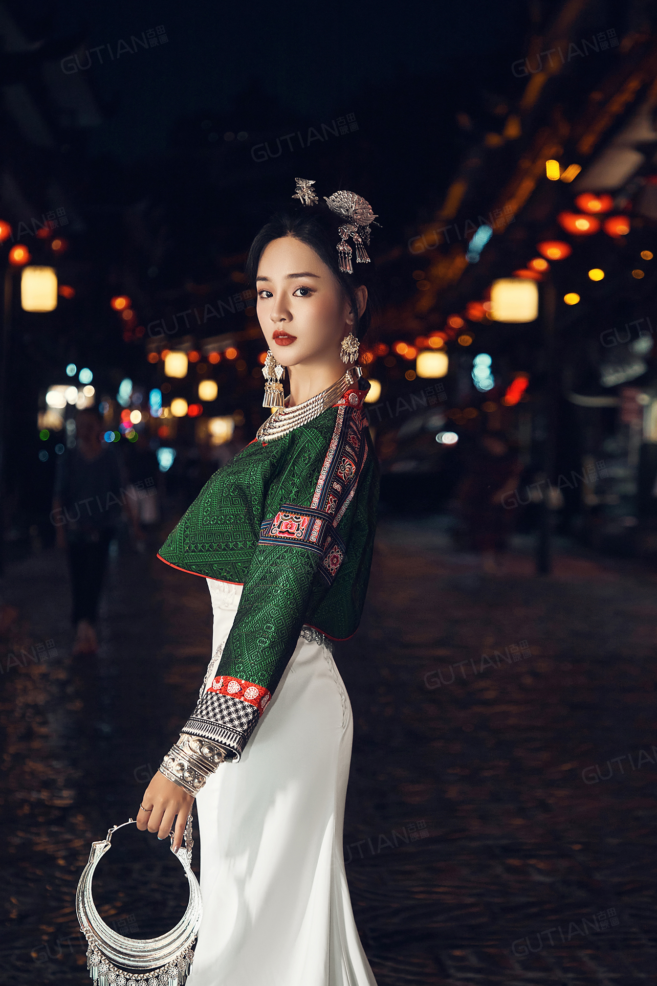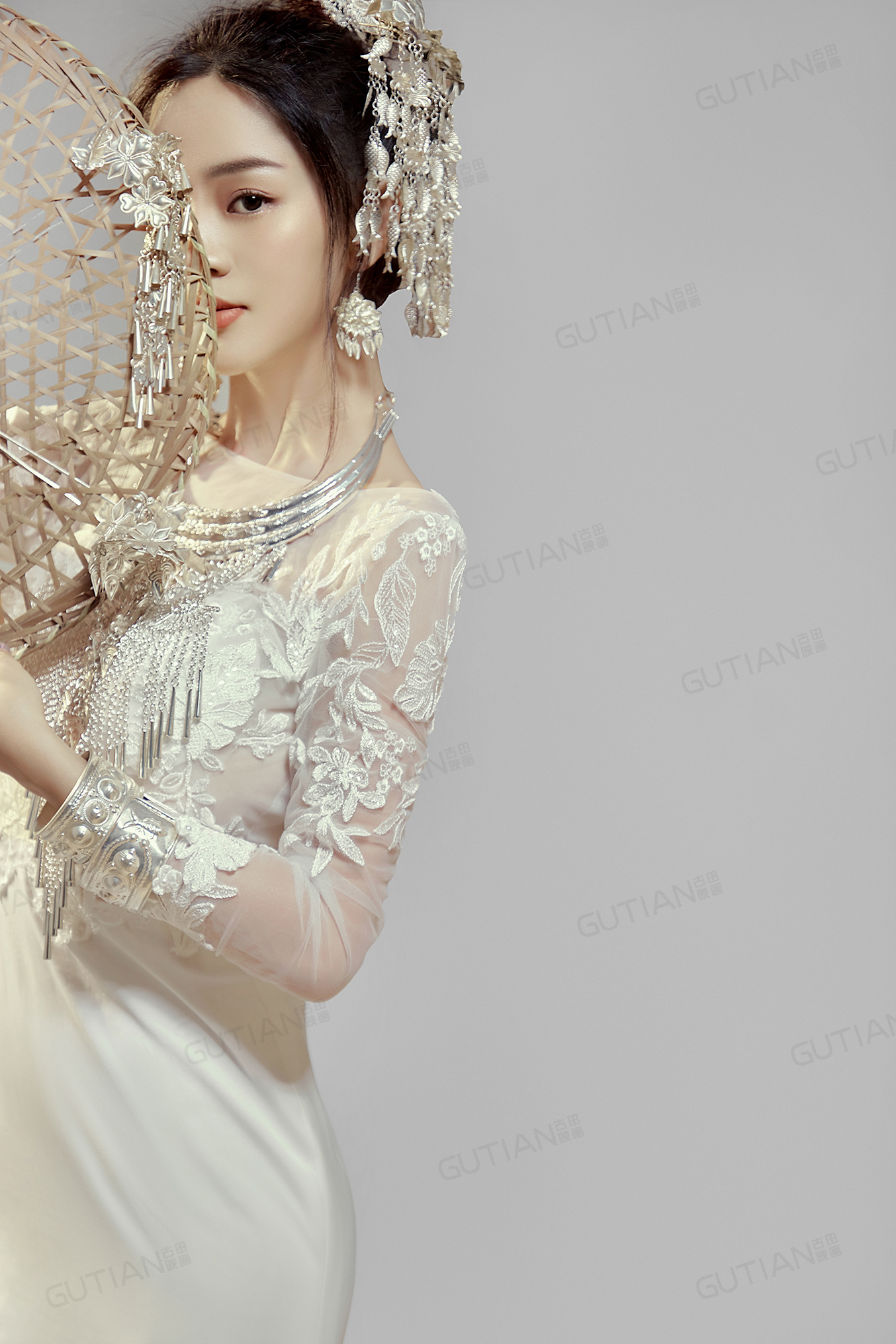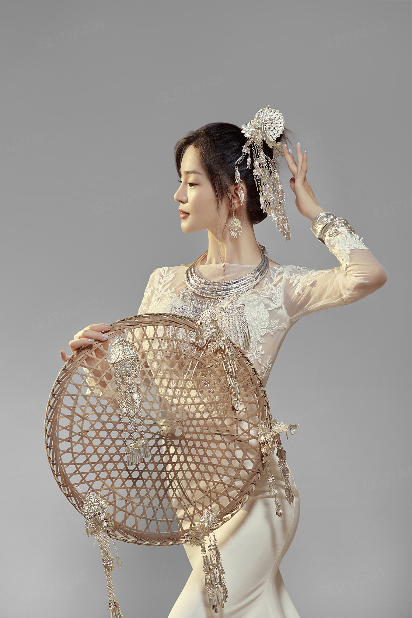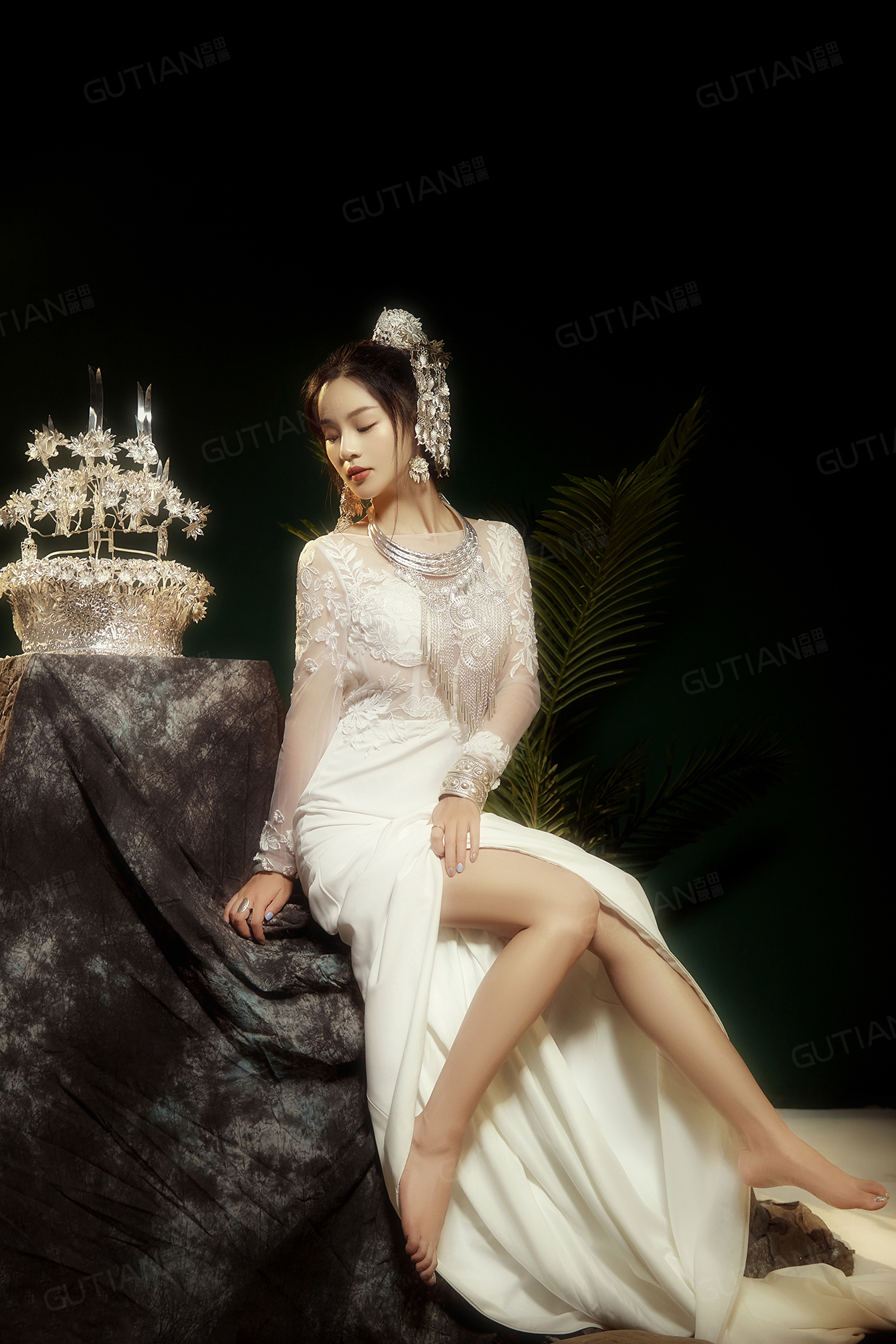 苗族银饰搭配白色修身礼服