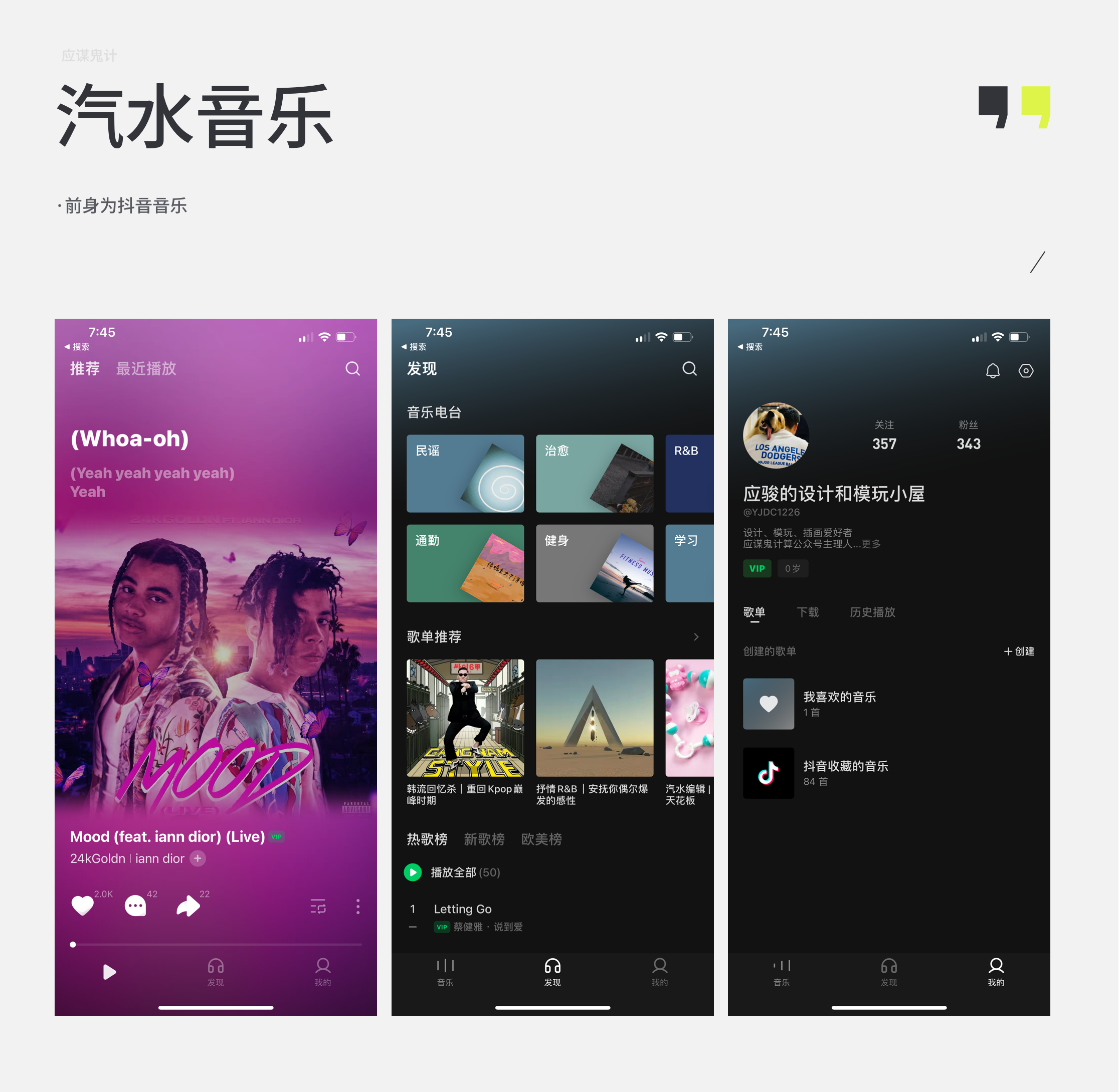 汽水音乐的前身是抖音音乐,所以整体的风格也是延续了抖音的黑色系风格,主色调和抖音的玫红色形成了一个对比,用了一个非常年轻的绿色调。页面的左上角用主色做了一个渐变,有种极光的效果。整体风格比较简约,但没有太突出的亮点。