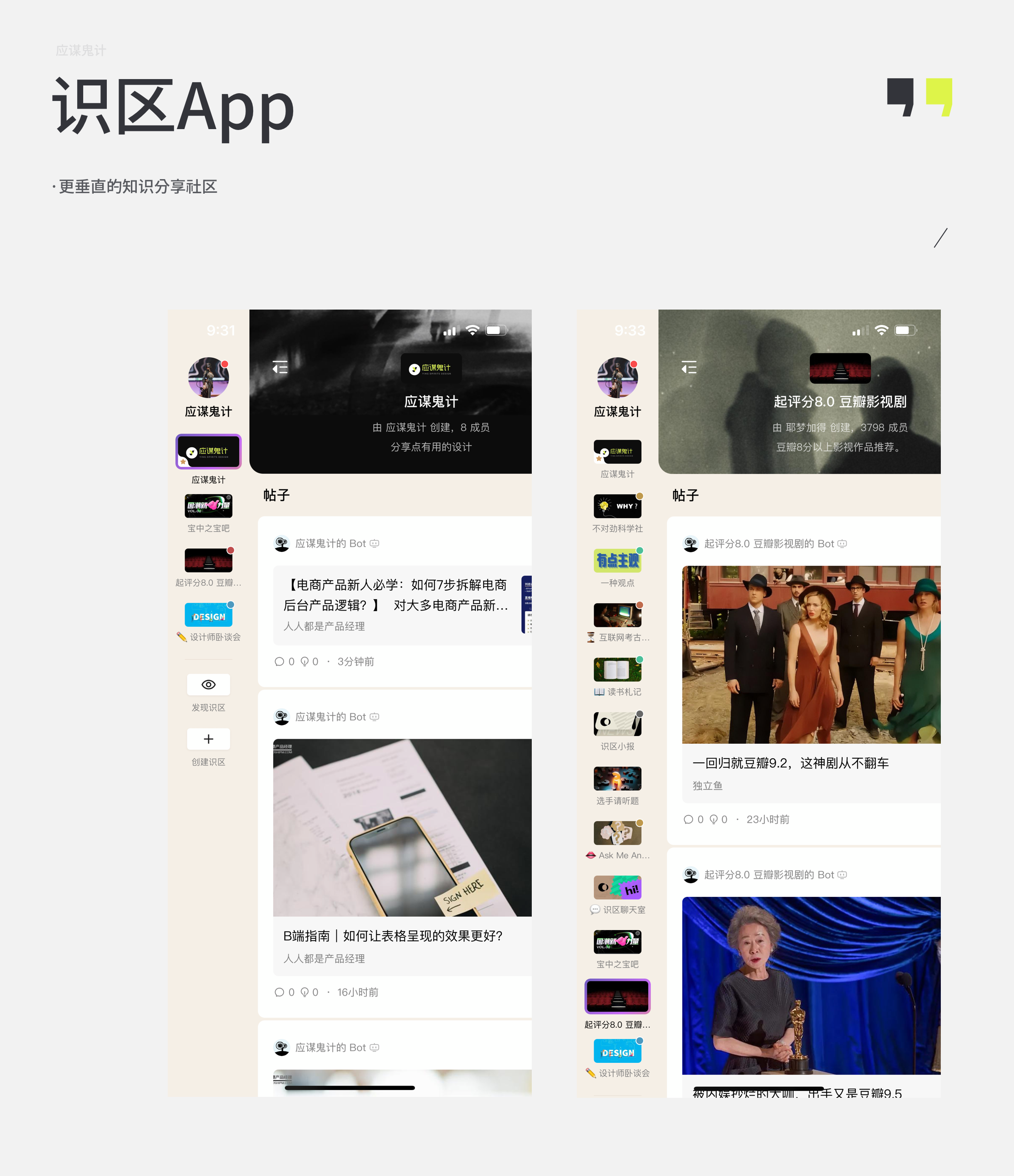 首先识区这个板块,我们可以看到它是通过右上角的抽屉导航来切换、创建、搜索想要的识区。这里体验上会有一些小问题,例如如果你关注的识区太多,那么发现识区和创建识区的按钮就要通过滑动来找到,但类似这样的功能按钮我们通常要做成固定,不能跟着内容的多少而改变位置。