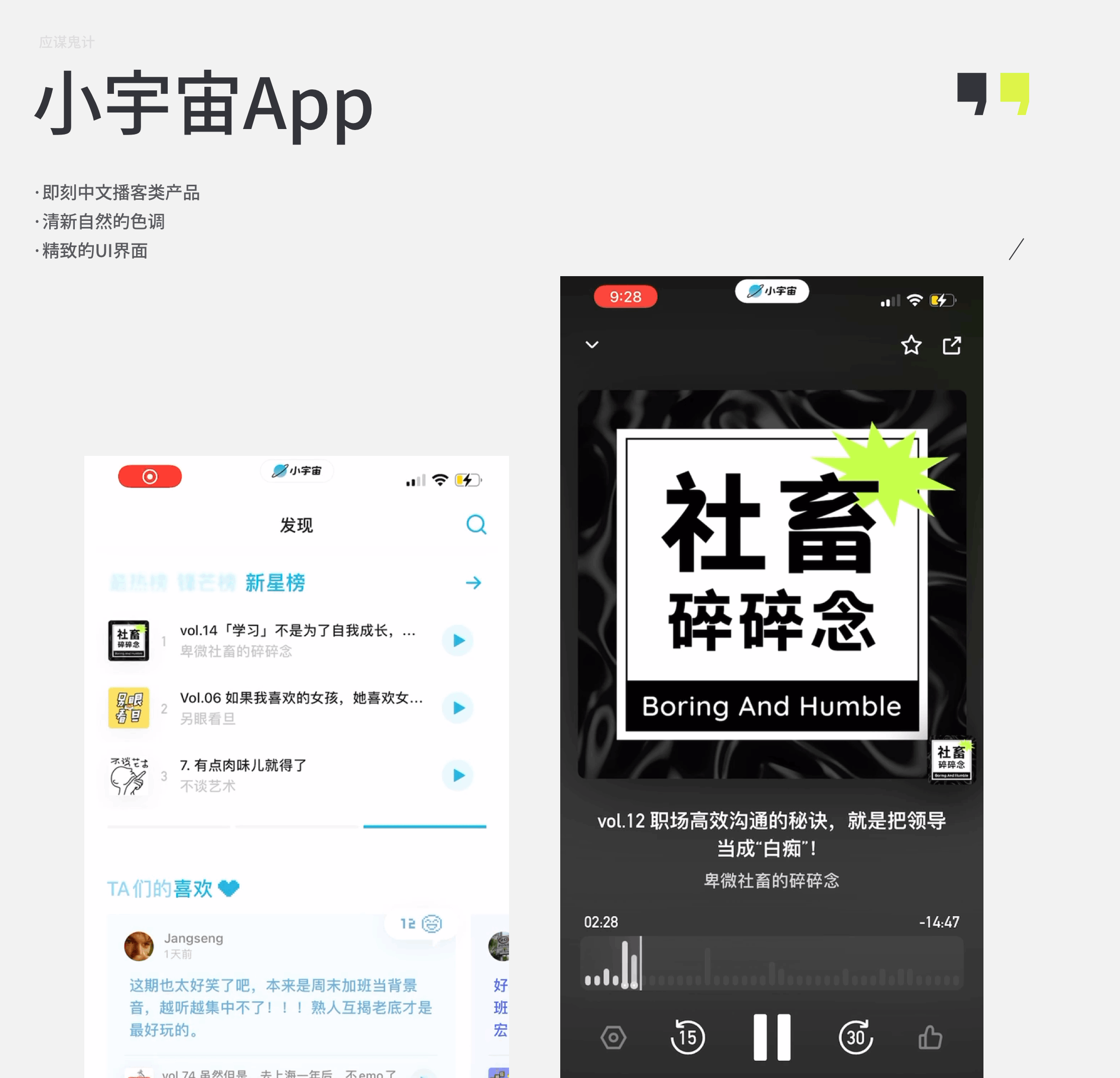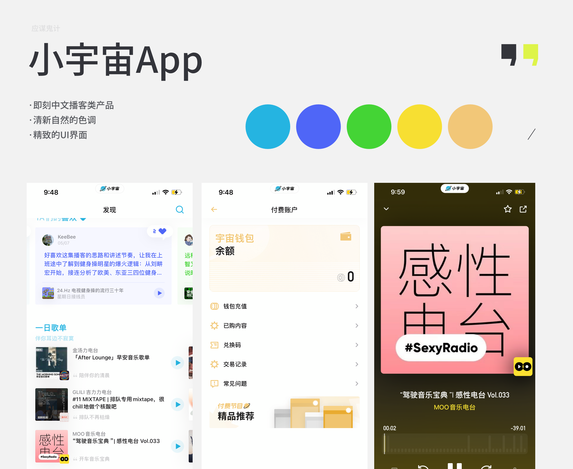小宇宙是即刻出品的中文播客类产品,这个产品其实在2020年就已经面世了,播客其实在国内还算是比较小众的领域,但是也有很大一批用户喜欢在这里创作内容,而国内这块的垂直领域产品都没有做的特别好的,所以小宇宙应运而生。它给我的第一印象是比较安静平和的,名字和星球形状的logo,也表达出产品希望这是一个能够汇聚一群具有独特品味的人们在这里交流和创造内容,形成一个圈子一个属于他们自己的空间。所以它在色彩上也选择了比较安静自然的天蓝色,以及低饱和度的一些辅助色。