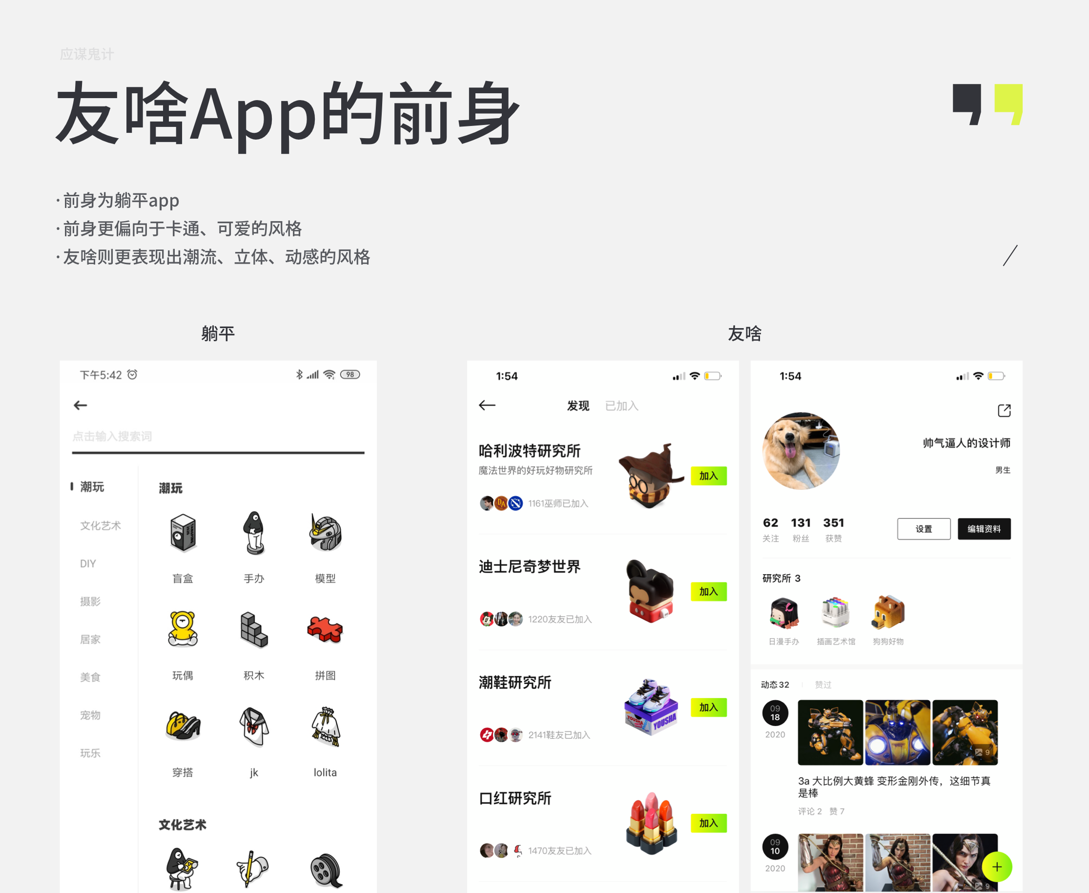 这个款应用的前身是躺平,我之前也是一位“手办”区的不知名博主。躺平app当时也是非常有代表性的一款年轻人兴趣社交产品,产品的UI设计风格也非常独特,吸引了很多年轻人来使用。现在迭代成为了“有啥”,当时整个UI风格给我的感觉虽然也是比较年轻化但是会更偏向于卡通、日系的感觉,因为他里面有很多的一些粗描边的插画很具有代表性。