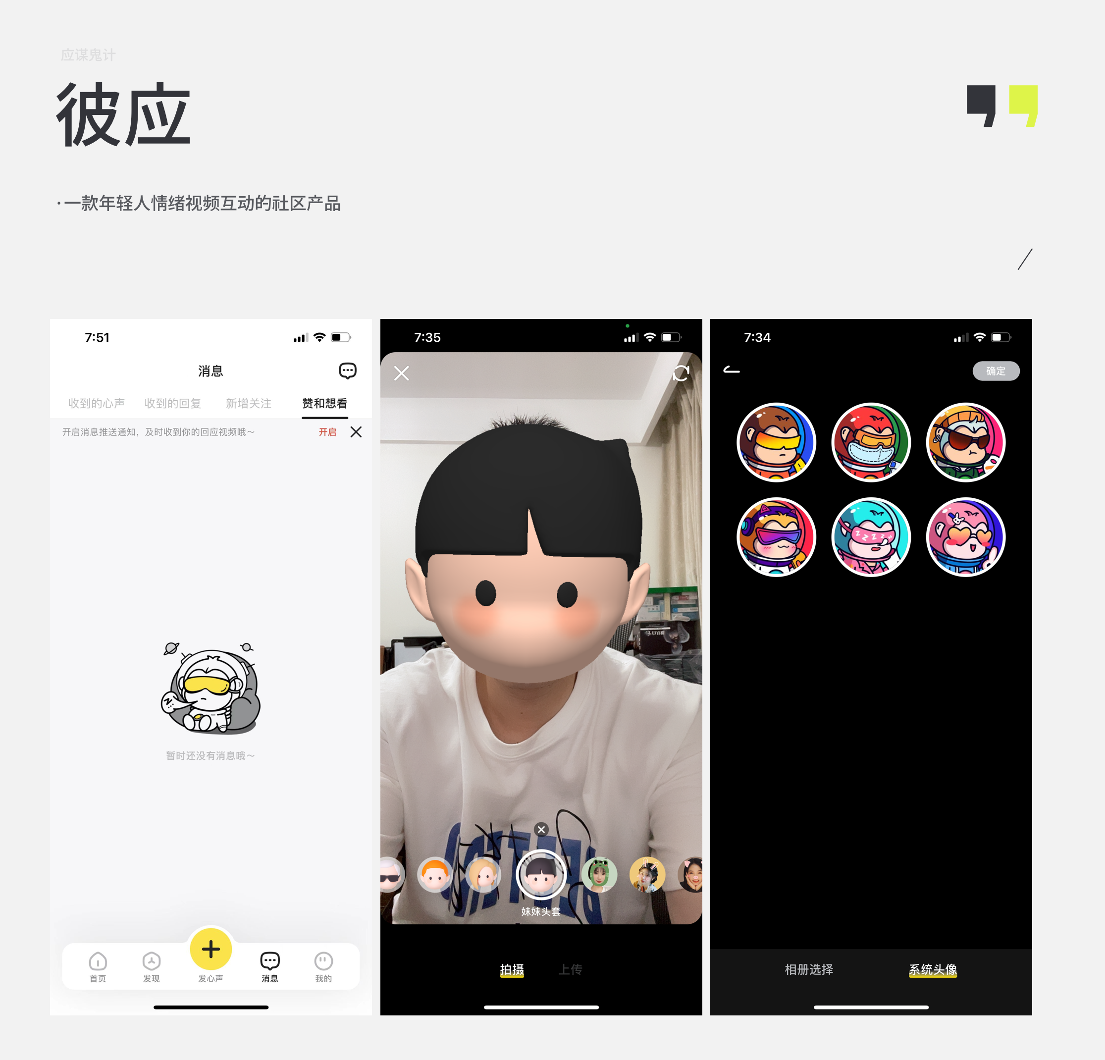 这款应用的UI的亮点不是很多,但是比较喜欢它的空页面的插画,也是一个线条的小插画,风格和当时的躺平有点类似。然后一些图标会比较圆润可爱一些。还有他的头预设头像也不错。在录制回应视频的时候还可以选择多个卡通虚拟头像的效果。