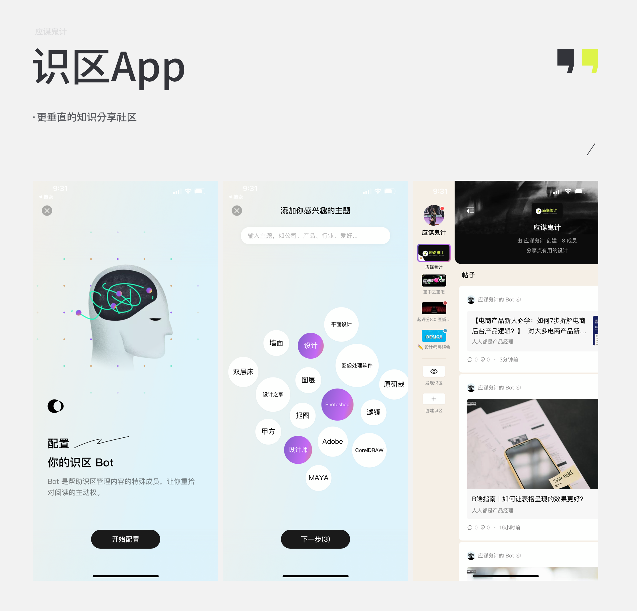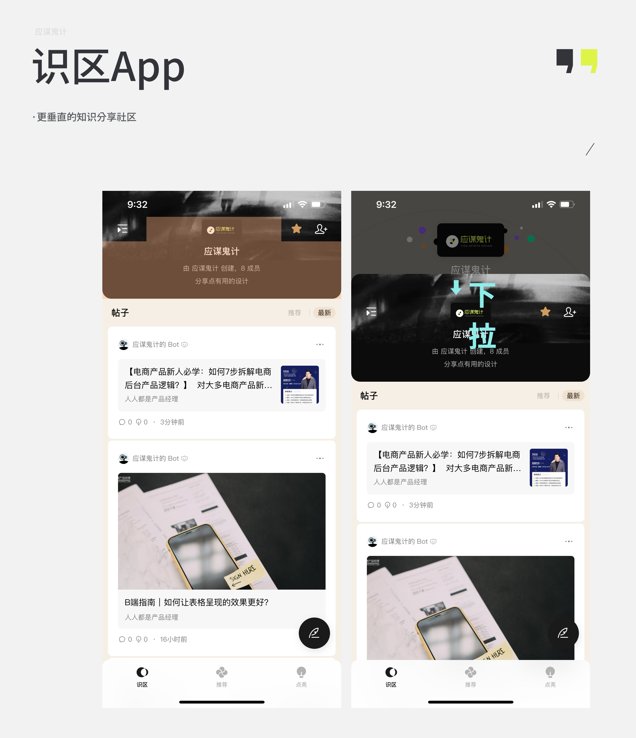 然后再来说一些设计上的小问题,首先产品分为了3个模块分别是:识区、推荐、点亮,识区相当于我关注的圈子和里面的内容,推荐则是通过你关注的识区和你自己的识区标签给予算法内容的推荐。最后点亮就相当于收藏。