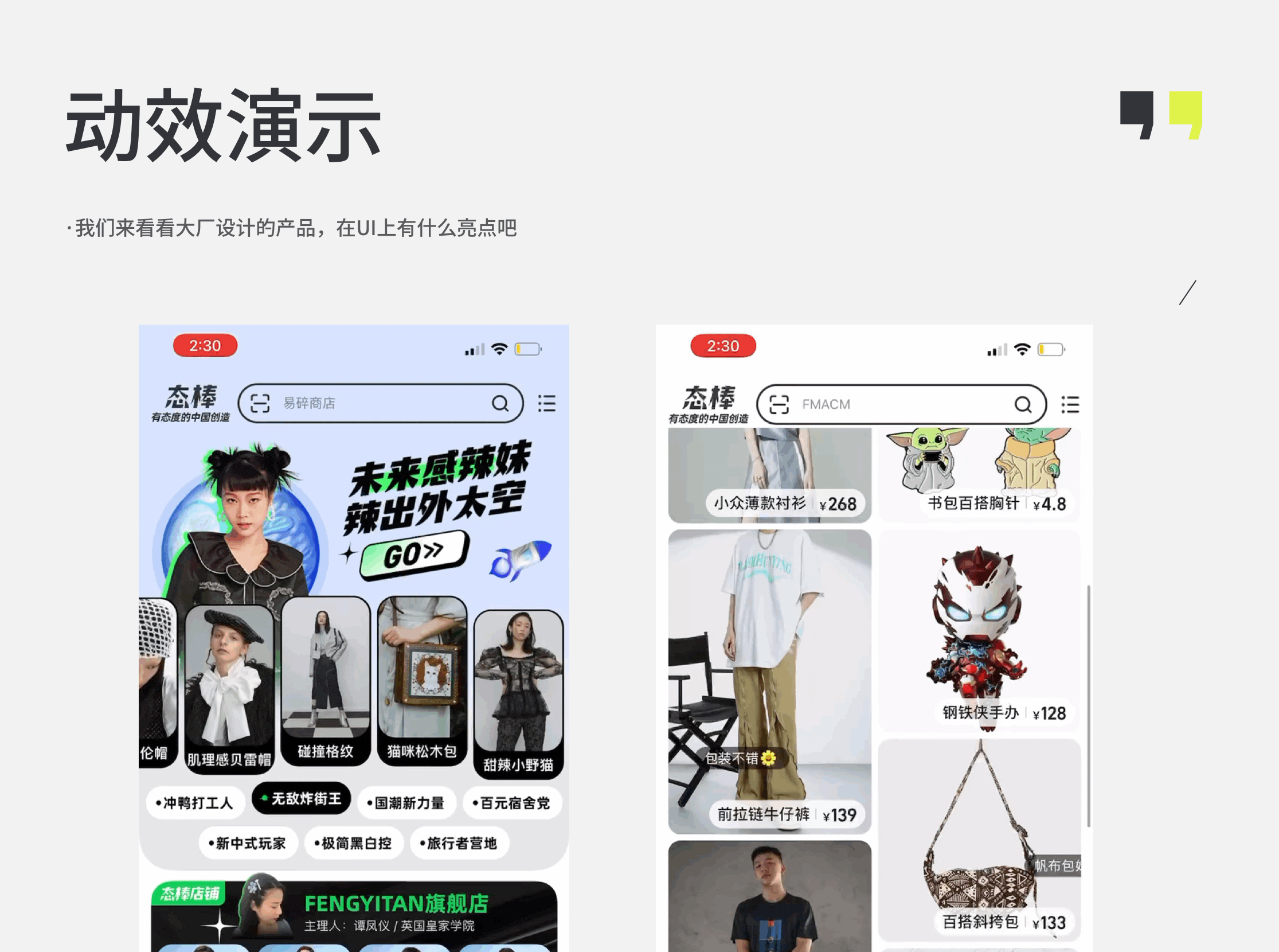 这款产品我第一眼看到的时候也觉得挺好玩的。这里面的一些元素也非常潮流和个性,例如低饱和度渐变的背景、带有质感的背景、镭射元素、粗字体、波点、毛玻璃等等。还有意思的地方就在于首页的标签图片采用了波浪形滚动的动效,在其他产品中可能都没有见过。一个主题切换到另一个主题又采用了翻转的动效,甚至底部的商品封面上就有自带弹幕的滚动,tab切换选中的样式用了一个类似笔绘的线条,这些设计样式都比较新颖,大胆。