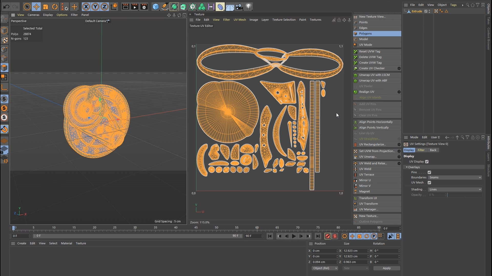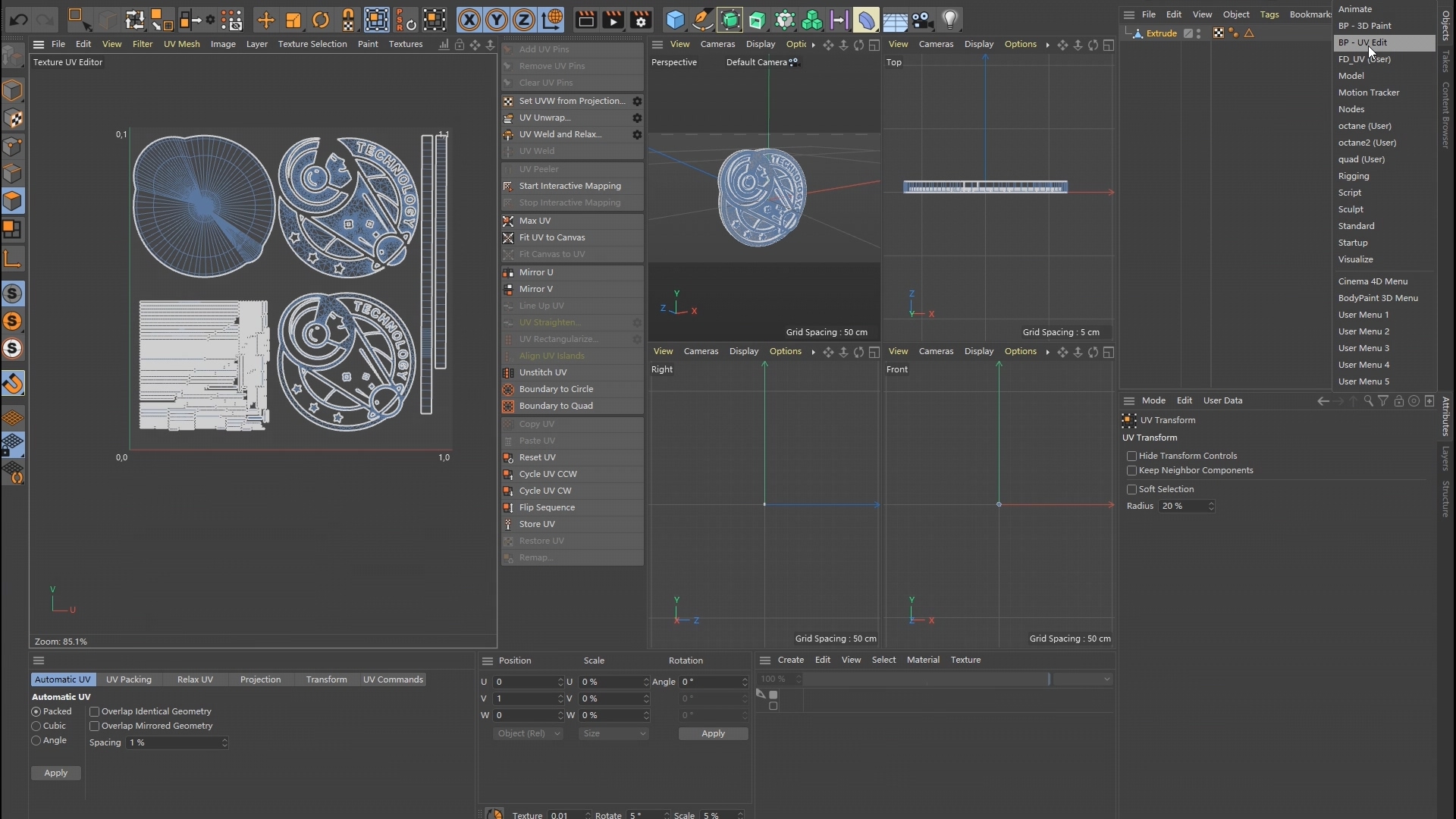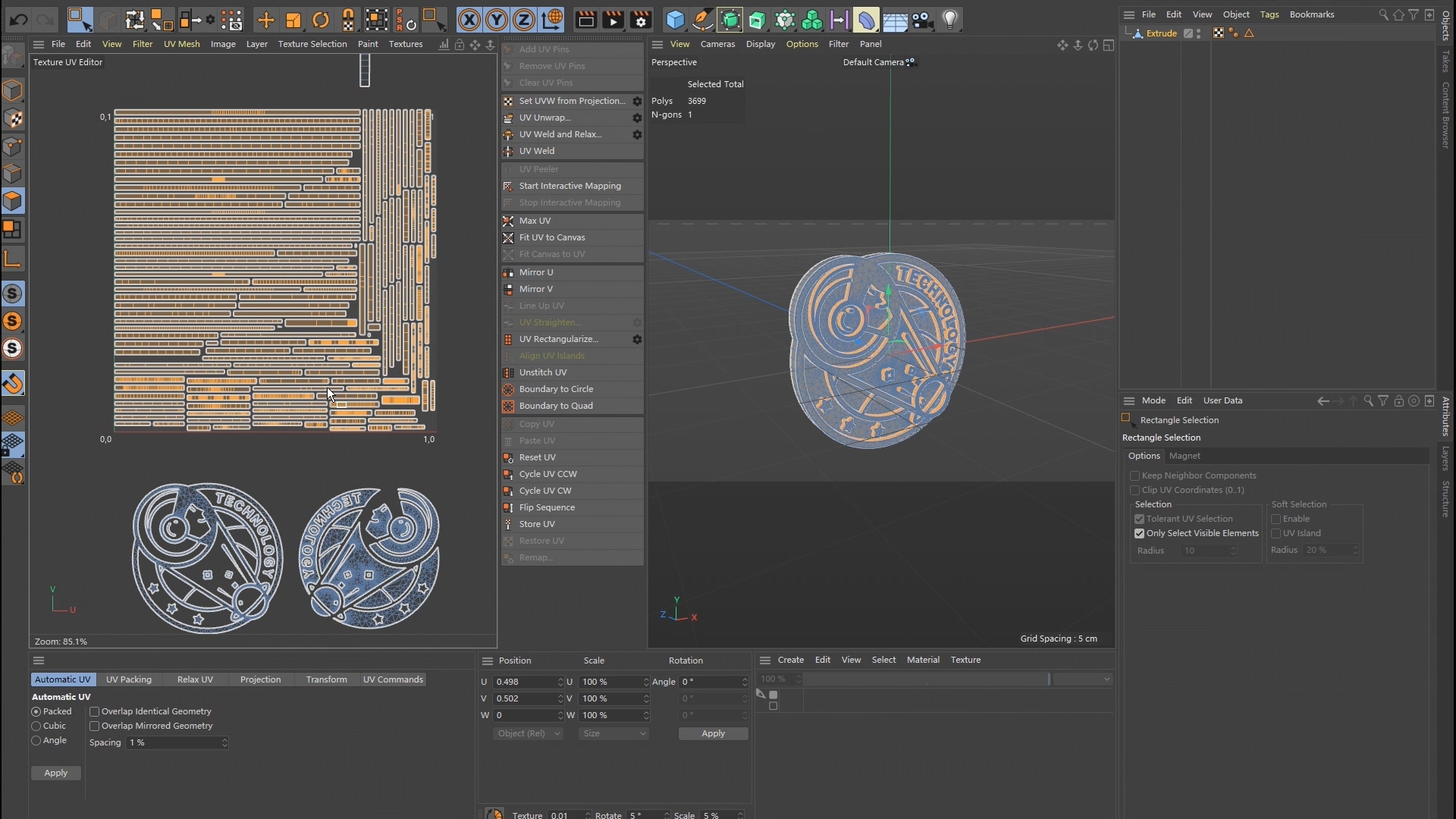 4.选中剩余的面,用C4D默认的展uv模式下,用automatic UV下packed展,最终展uv效果如下