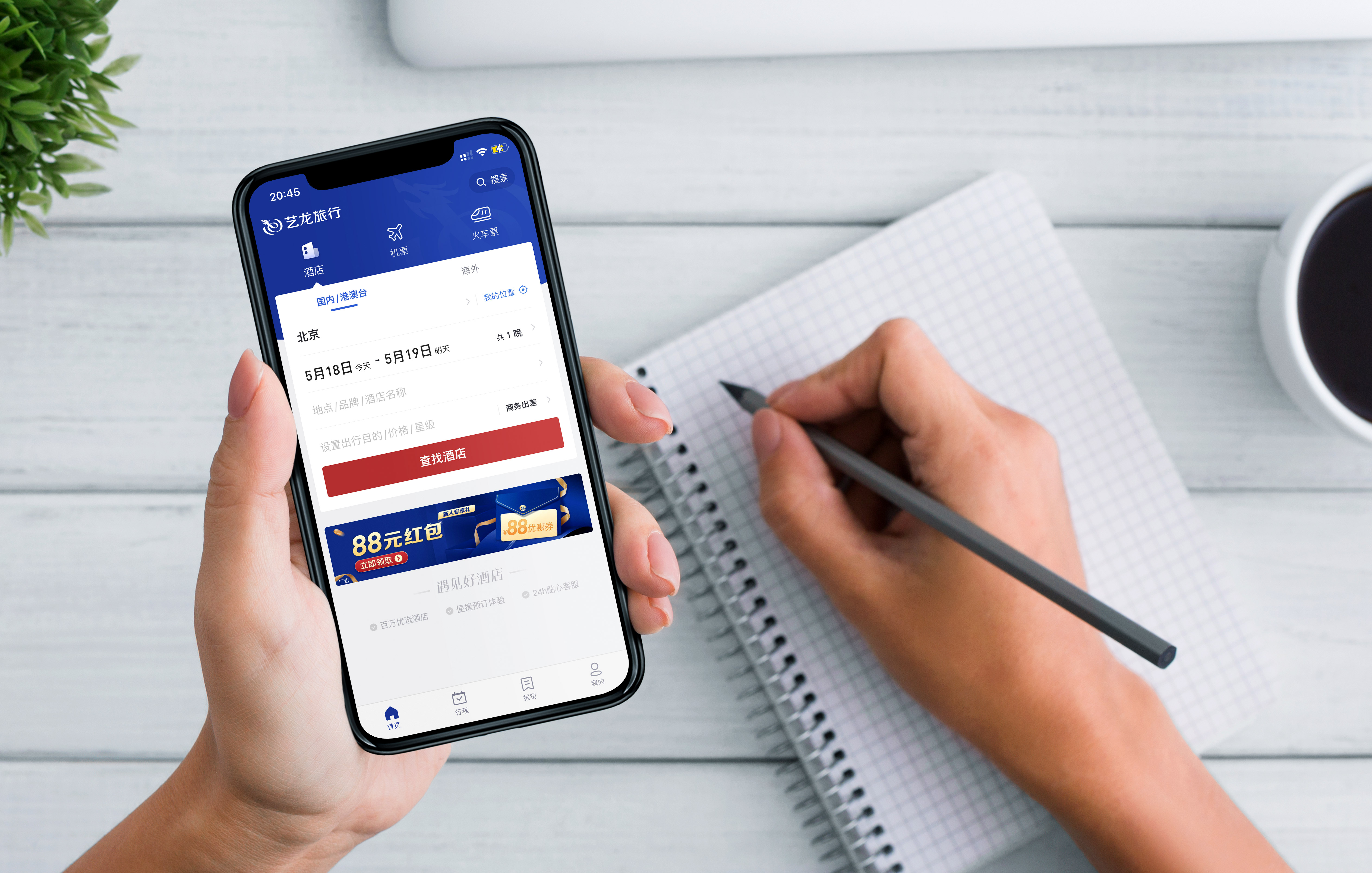 与此同时,艺龙旅行还重新构建和设计了APP的界面,提升用户体验。从上手体验的感觉来说,全面升级的APP界面的设计亮点在于简约、轻商务这两个核心点上。
