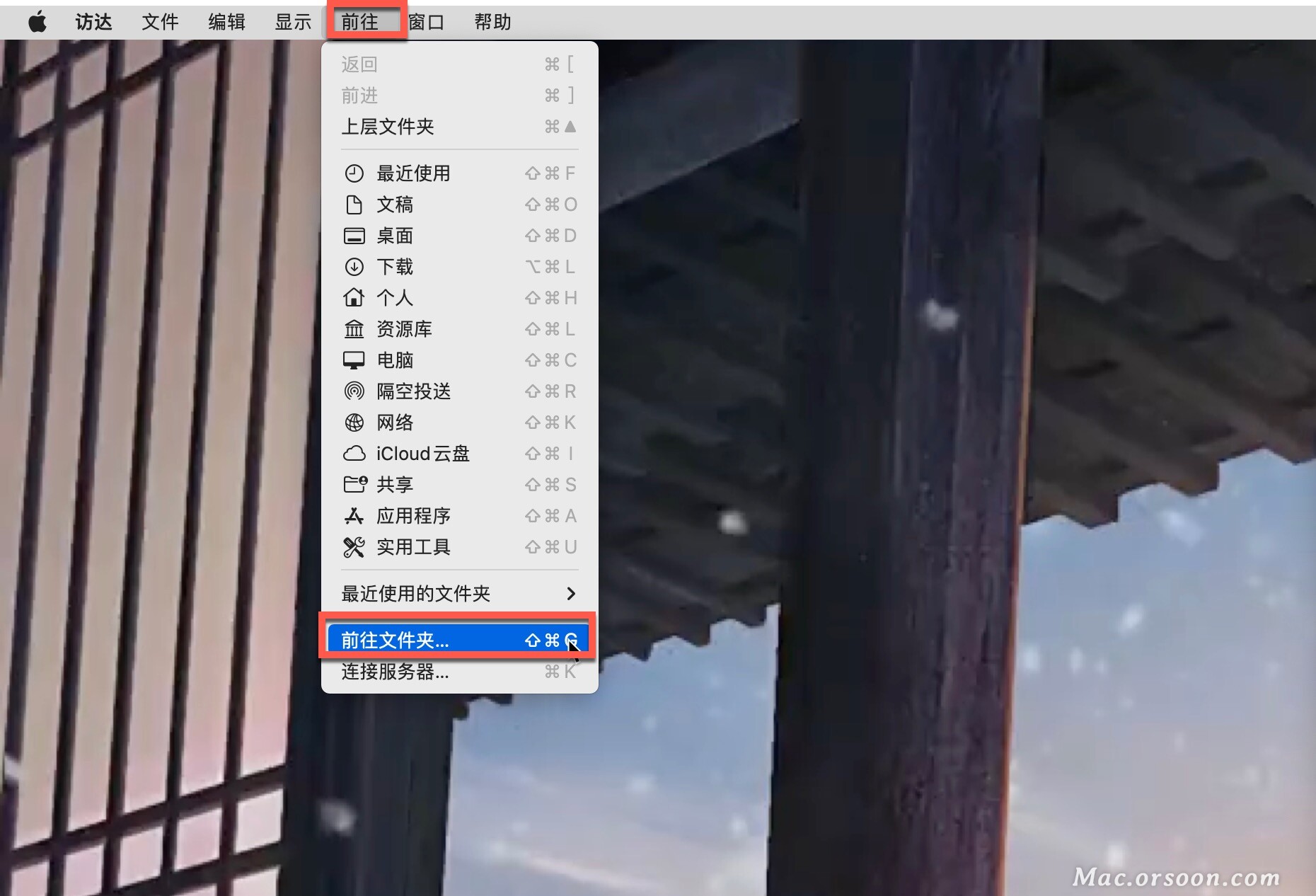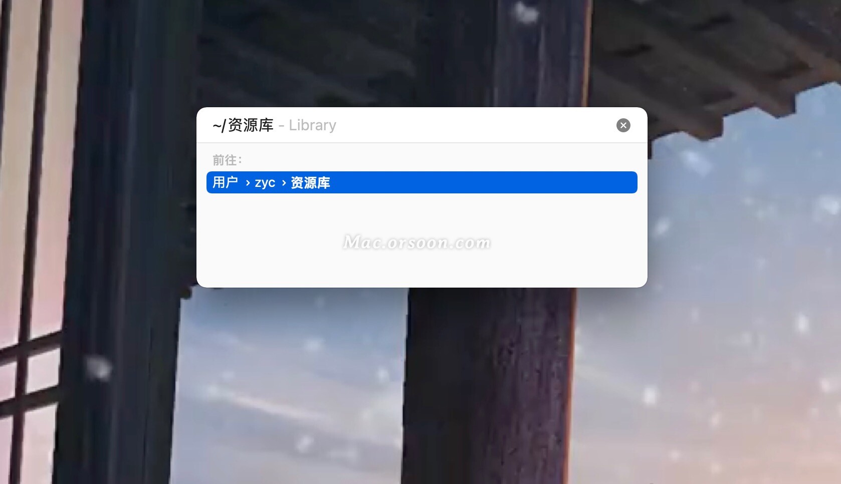 2、在“前往文件夹”对话框中,键入 ~/资源库