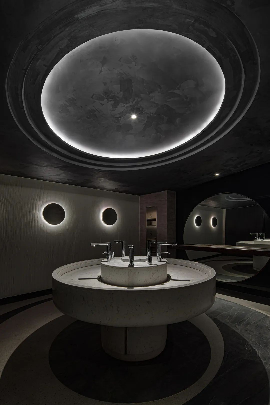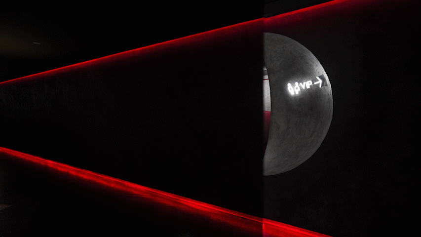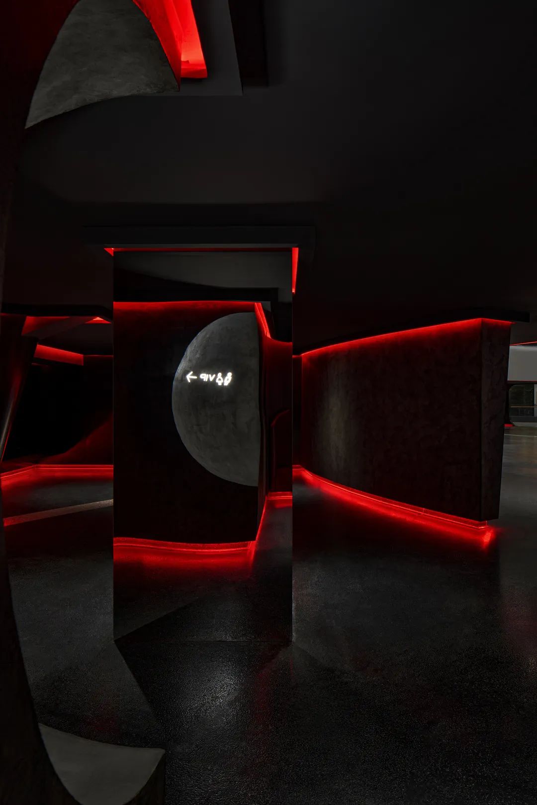 导视标识灵感是一个凹陷的月球表面,灵感来自平克·弗洛伊德(PinkFloyd)专辑《月之暗面》(《TheDarkSideofTheMoon》),设计师用可以隐藏的暗面,完成这场让人分不清真假虚实的视觉游戏。