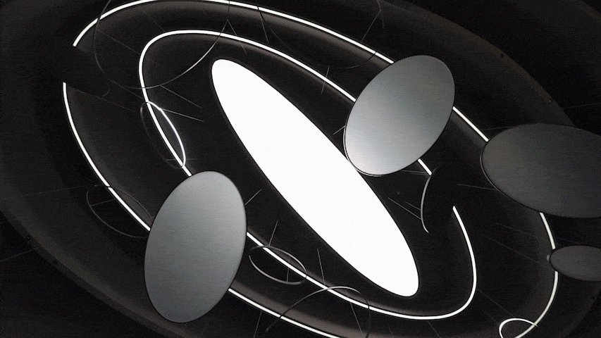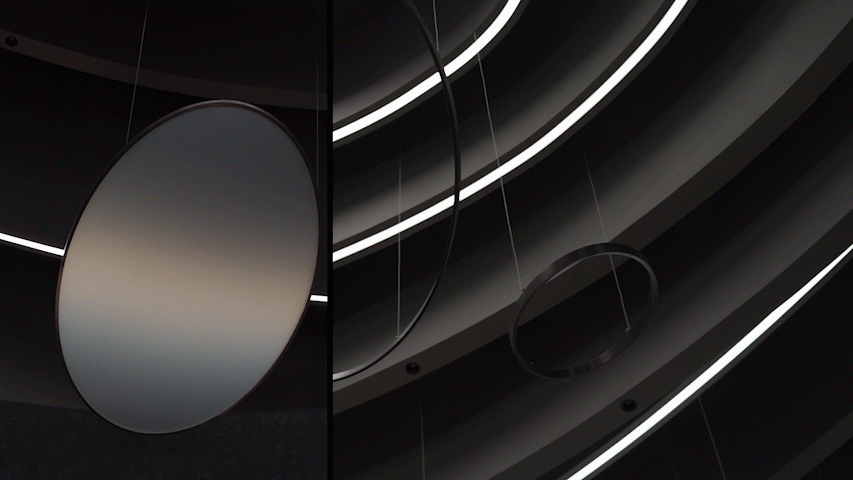巨大的环形与大量垂吊装置创造出一种空灵的漂浮感,这种漂浮感像是置身于无穷无界的宇宙中,让我们可以只凭自由意志与喜好,肆意触发各种奇特的波长,与自己、与不明物种进行对话。