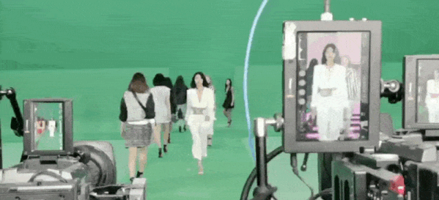 模特们在绿幕中走秀,9D VIRTUAL九度虚拟科技团队通过AR技术实时渲染出品牌需要的T台效果。