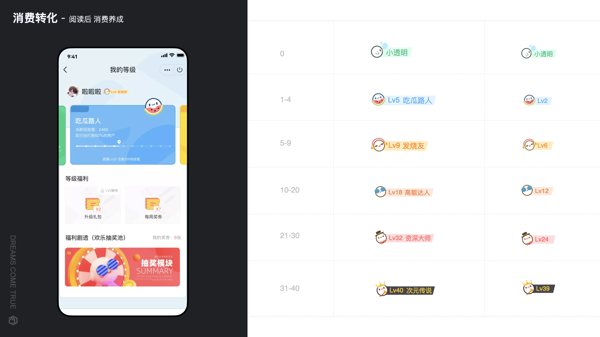 阅读后- 最后是阅读完作品后的消费养成,我们尝试去搭建用户的荣誉体系,首先增加针对作品的打赏道具,用户可以根据自己喜好去对作品进行打赏或者吐槽,满足用户对于作品的情感宣泄。同时我们也进行了荣誉体系的搭建,对整个等级体系进行升级,以前我们等级感知,趣味性都很差。于是针对等级体系,我们开展了全民共创模式,在用户群体中去征集关于等级的创意想法,强化参与感。新版等级新增6种不同特殊样式,强化不同等级之间的差异感,刺激用户升级的活跃度。最后会设计用户专属个人等级卡片和打赏榜,满足个人成就感,加强用户对于荣誉体系的粘性。