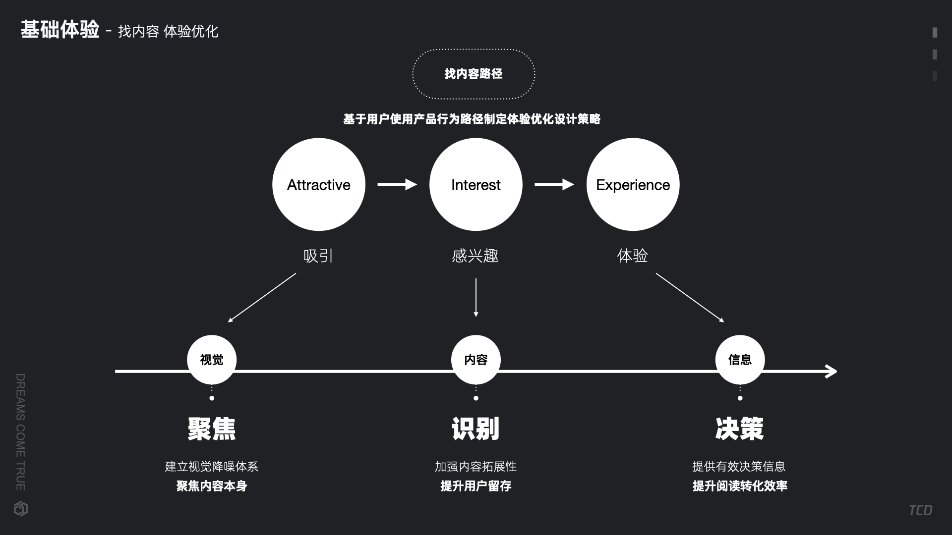 基于内容消费模型,我们分别对用户寻找内容进行了:视觉聚焦-建立视觉降噪体系、内容识别-加强内容拓展性、信息决策-提供有效决策信息等不同策略的优化。